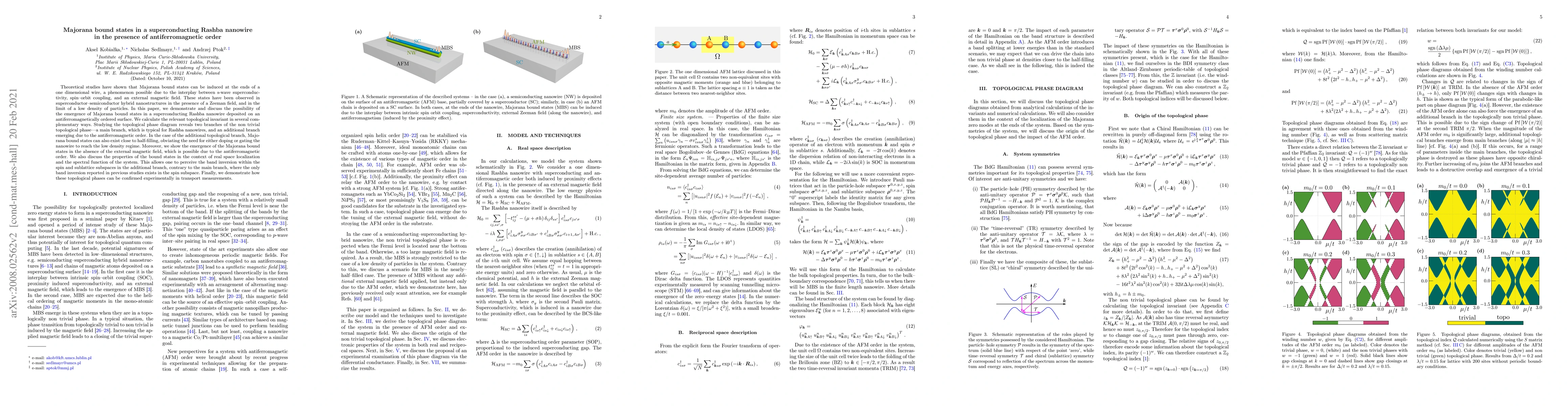 Theoretical studies have shown that Majorana bound states can be induced at the ends of a one dimensional wire, a phenomenon possible due to the interplay between s-wave superconductivity, spin-orbit coupling, and an external magnetic field. These states have been observed in superconductor-semiconductor hybrid nanostructures in the presence of a Zeeman field, and in the limit of a low density of particles. In this paper, we demonstrate and discuss the possibility of the emergence of Majorana bound states in a superconducting Rashba nanowire deposited on an antiferromagnetically ordered surface. We calculate the relevant topological invariant in several complementary ways. Studying the topological phase diagram reveals two branches of the non trivial topological phase -- a main branch, which is typical for Rashba nanowires, and an additional branch emerging due to the antiferromagnetic order. In the case of the additional topological branch, Majorana bound states can also exist close to half-filling, obviating the need for either doping or gating the nanowire to reach the low density regime. Moreover, we show the emergence of the Majorana bound states in the absence of the external magnetic field, which is possible due to the antiferromagnetic order. We also discuss the properties of the bound states in the context of real space localization and the spectral function of the system. This allows one to perceive the band inversion within the spin and sublattice subspaces in the additional branch, contrary to the main branch, where the only band inversion reported in previous studies exists in the spin subspace. Finally, we demonstrate how these topological phases can be confirmed experimentally in transport measurements.