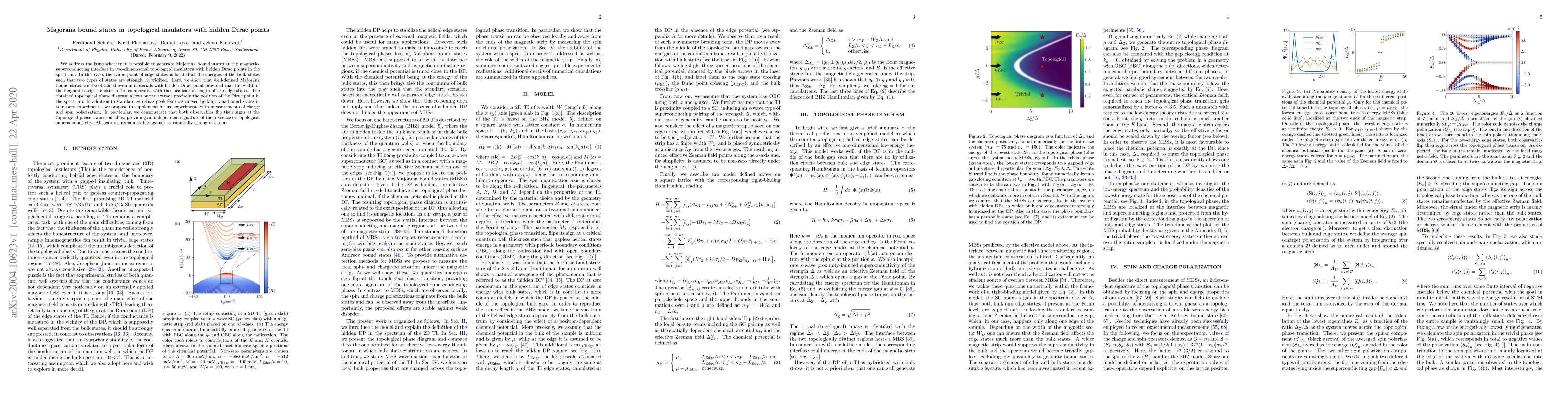 We address the issue whether it is possible to generate Majorana bound states at the magnetic-superconducting interface in two-dimensional topological insulators with hidden Dirac points in the spectrum. In this case, the Dirac point of edge states is located at the energies of the bulk states such that two types of states are strongly hybridized. Here, we show that well-defined Majorana bound states can be obtained even in materials with hidden Dirac point provided that the width of the magnetic strip is chosen to be comparable with the localization length of the edge states. The obtained topological phase diagram allows one to extract precisely the position of the Dirac point in the spectrum. In addition to standard zero-bias peak features caused by Majorana bound states in transport experiments, we propose to supplement future experiments with measurements of charge and spin polarization. In particular, we demonstrate that both observables flip their signs at the topological phase transition, thus, providing an independent signature of the presence of topological superconductivity. All features remain stable against substantially strong disorder.