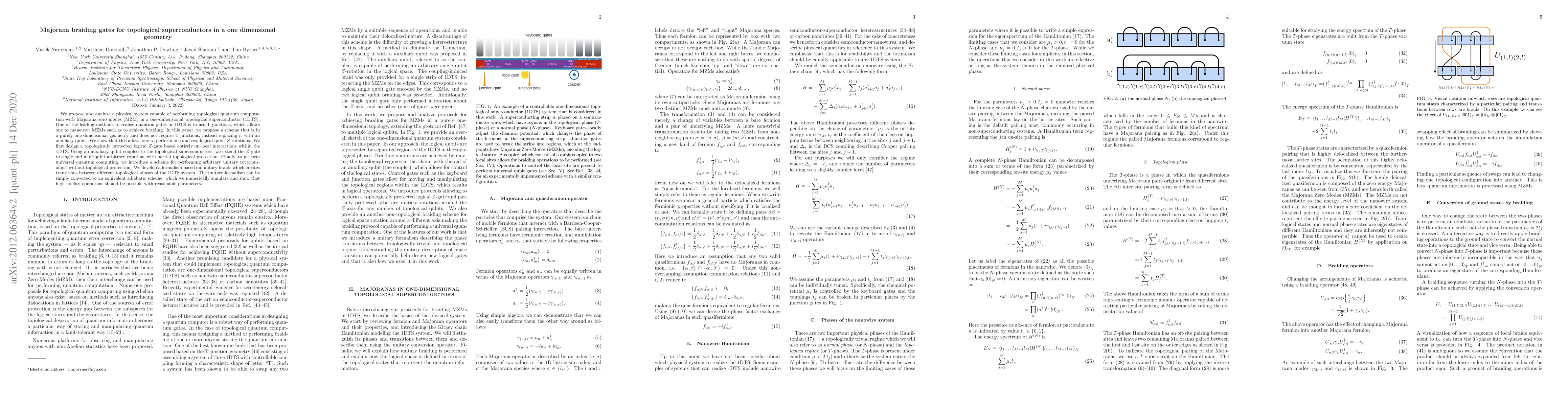 We propose and analyze a physical system capable of performing topological quantum computation with Majorana zero modes (MZM) in a one-dimensional topological superconductor (1DTS). One of the leading methods to realize quantum gates in 1DTS is to use T-junctions, which allows one to maneuver MZMs such as to achieve braiding. In this paper, we propose a scheme that is in a purely one-dimensional geometry and does not require T-junctions, instead replacing it with an auxiliary qubit. We show that this allows one to perform one and two logical qubit $ Z $ rotations. We first design a topologically protected logical $Z$-gate based entirely on local interactions within the 1DTS. Using an auxiliary qubit coupled to the topological superconductors, we extend the $Z$-gate to single and multiqubit arbitrary rotations with partial topological protection. Finally, to perform universal quantum computing, we introduce a scheme for performing arbitrary unitary rotations, albeit without topological protection. We develop a formalism based on unitary braids which creates transitions between different topological phases of the 1DTS system. The unitary formalism can be simply converted to an equivalent adiabatic scheme, which we numerically simulate and show that high fidelity operations should be possible with reasonable parameters.