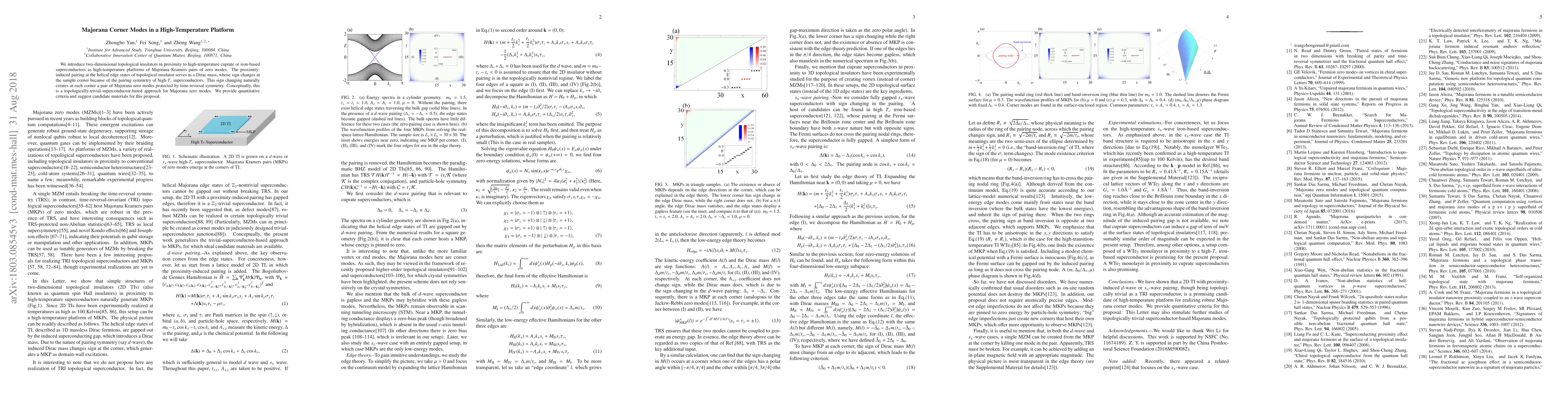 This paper proposes a high-temperature platform for Majorana zero modes using two-dimensional topological insulators near cuprate or iron-based superconductors. It demonstrates that proximity-induced pairing generates Majorana corner modes protected by time-reversal symmetry, and provides criteria and candidate materials for this approach.