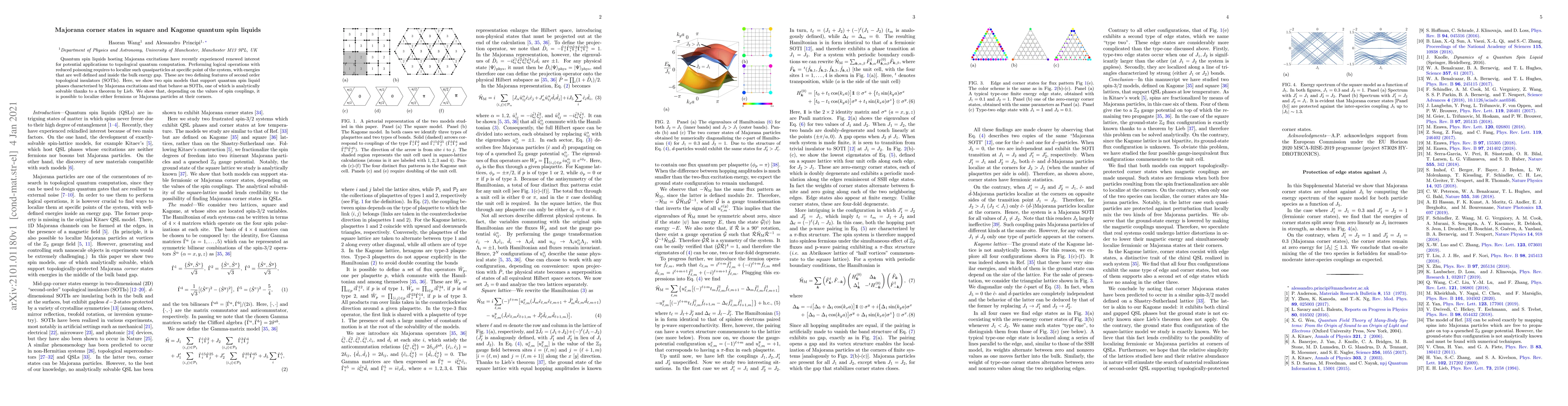 The paper presents a detailed analysis of two spin-3/2 models on Kagome and square lattices, demonstrating their QSL phases and the emergence of Majorana particles, along with topologically protected corner states.