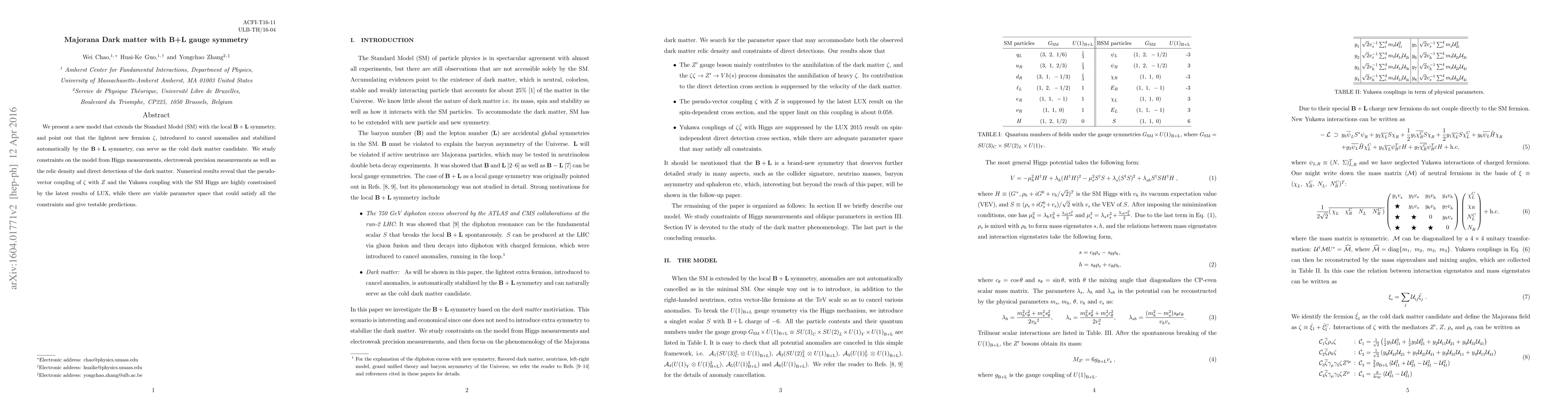 This paper proposes a new model extending the Standard Model with local B+L symmetry, where the lightest new fermion $\zeta$ acts as a cold dark matter candidate. It finds viable parameter spaces that satisfy constraints from Higgs and electroweak measurements, while also being testable through direct detection experiments.
