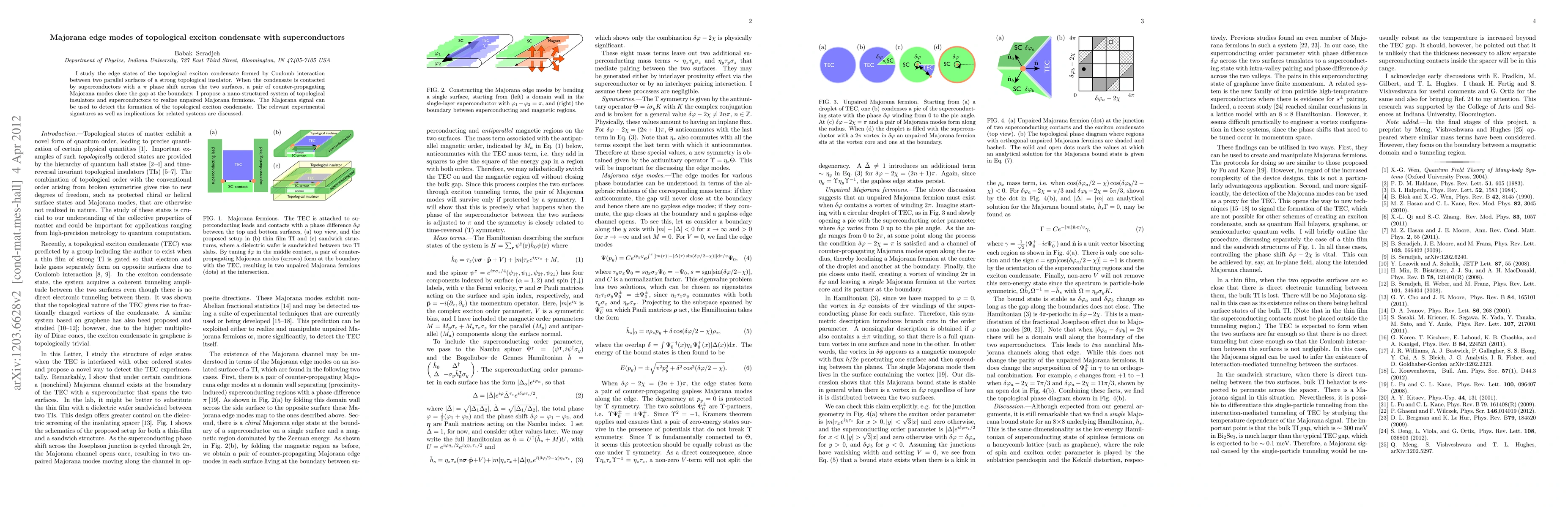I study the edge states of the topological exciton condensate formed by Coulomb interaction between two parallel surfaces of a strong topological insulator. When the condensate is contacted by superconductors with a {\pi} phase shift across the two surfaces, a pair of counter-propagating Majorana modes close the gap at the boundary. I propose a nano-structured system of topological insulators and superconductors to realize unpaired Majorana fermions. The Majorana signal can be used to detect the formation of the topological exciton condensate. The relevant experimental signatures as well as implications for related systems are discussed.