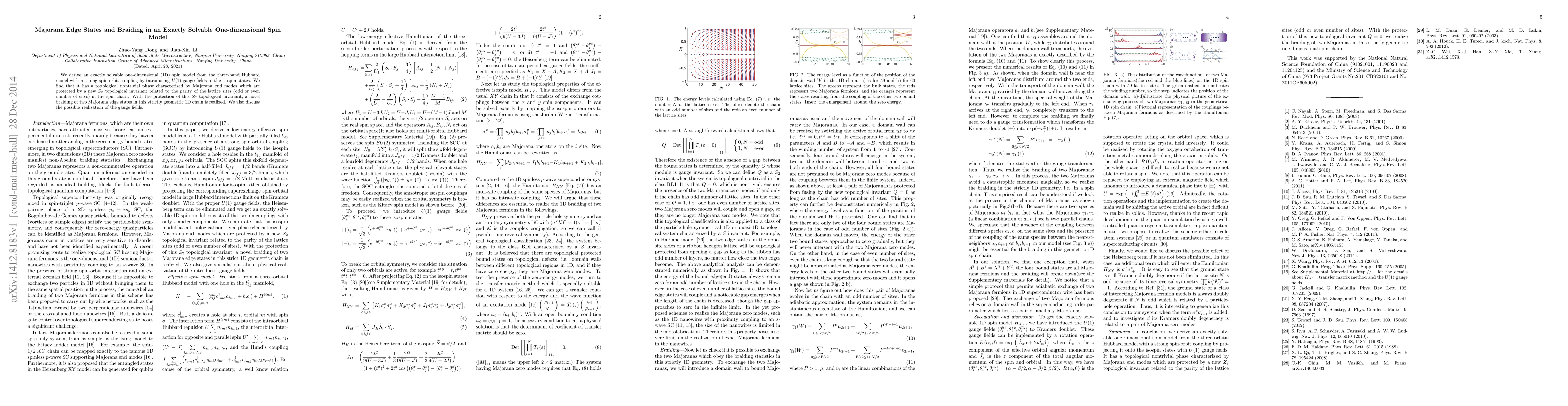 This paper presents an exactly solvable 1D spin model derived from the three-band Hubbard model, featuring Majorana edge states protected by a new Z_2 topological invariant. The model enables novel braiding of two Majorana edge states, with potential implications for topological quantum computing.