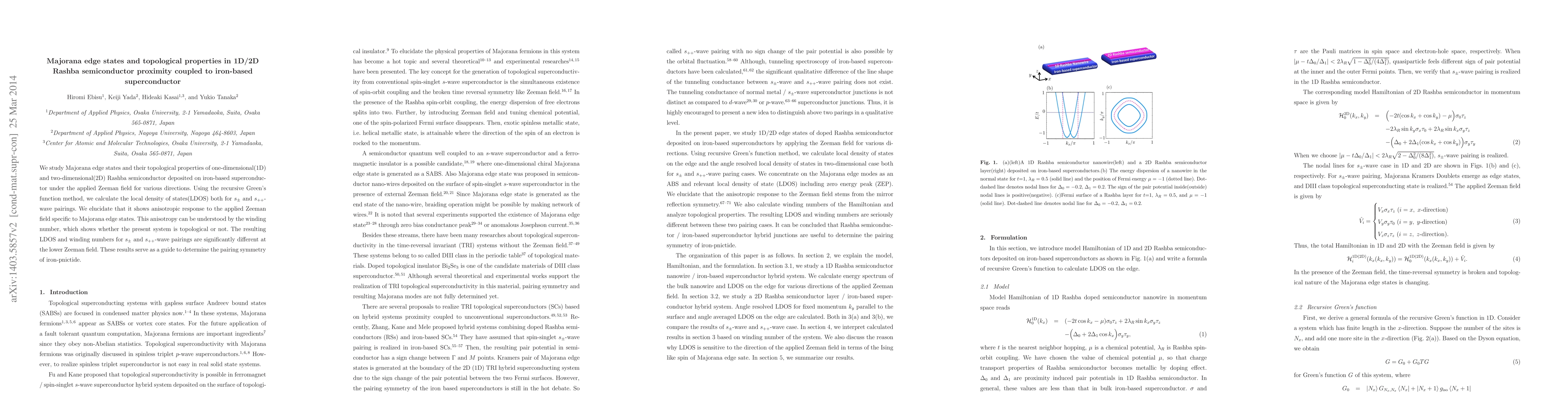 This paper investigates the topological properties and Majorana edge states in 1D and 2D Rashba semiconductors coupled to iron-based superconductors under various Zeeman fields. The study reveals anisotropic responses to the field, determined by the winding number, and highlights significant differences in local density of states for different superconducting pairing symmetries.