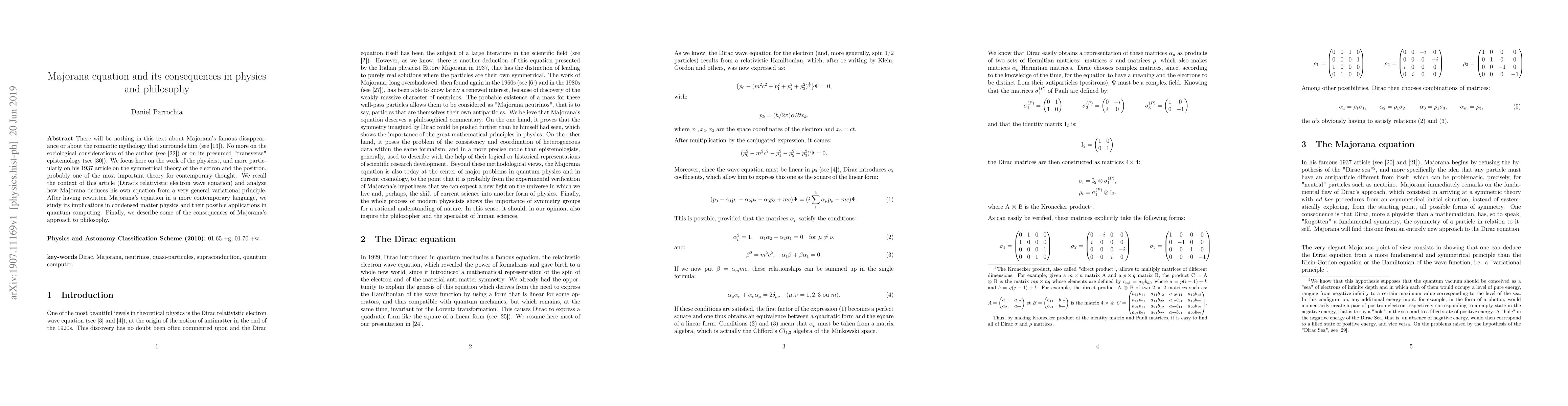 We focus here on the work of the italian physicist Ettore Majorana, and more particularly on his 1937 article on the symmetrical theory of the electron and the positron, probably one of the most important theory for contemporary thought. We recall the context of this article (Dirac relativistic electron wave equation) and analyze how Majorana deduces his own equation from a very general variational principle. After having rewritten Majorana equation in a more contemporary language, we study its implications in condensed matter physics and their possible applications in quantum computing. Finally, we describe some of the consequences of Majorana approach to philosophy.