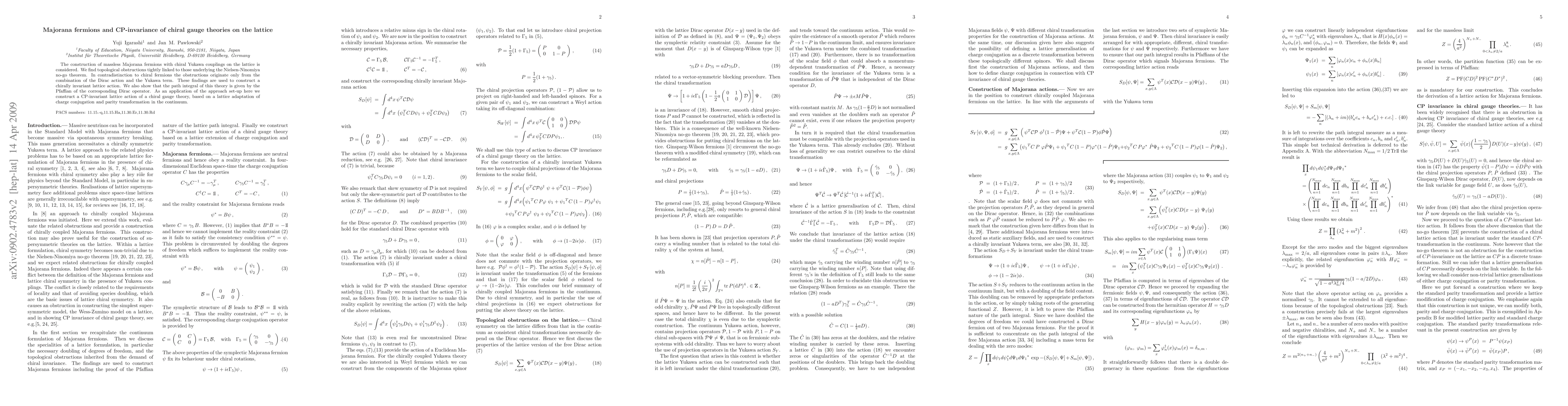Summary: This paper explores the construction of massless Majorana fermions with chiral Yukawa couplings on a lattice, identifying topological obstructions linked to the Nielsen-Ninomiya theorem. It proposes a chirally invariant lattice action and demonstrates that the path integral of this theory is expressed as the Pfaffian of the Dirac operator. The study culminates in the development of a CP-invariant lattice action for chiral gauge theories through an adapted lattice formulation of charge conjugation and parity transformation.
