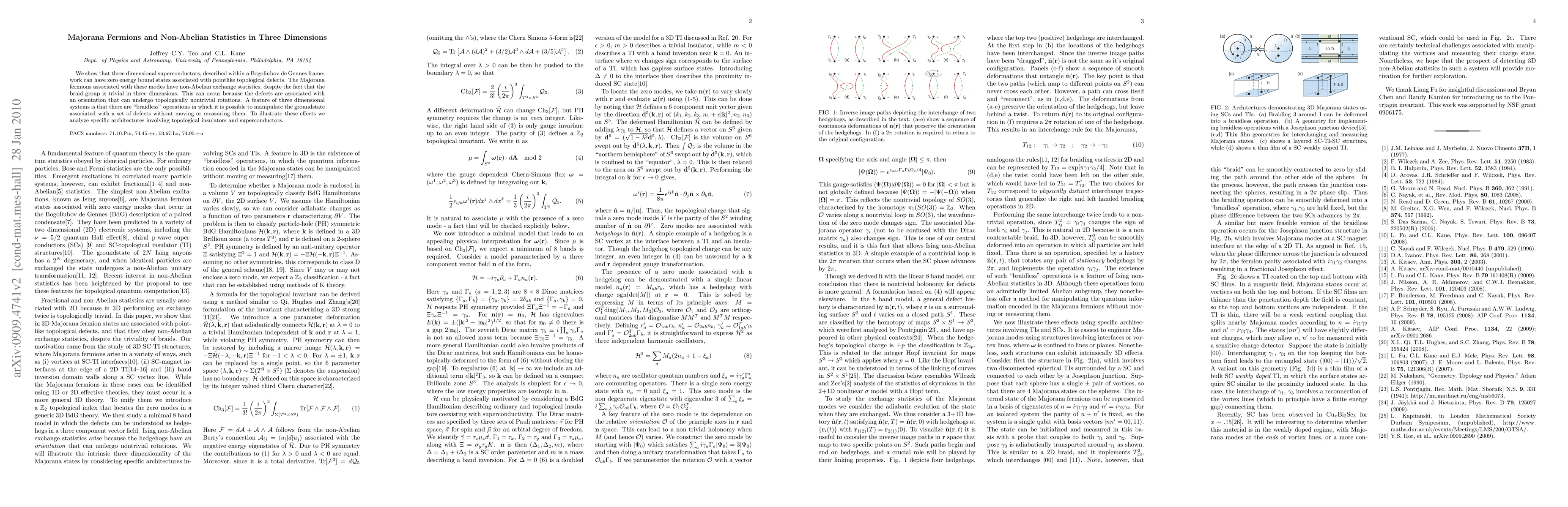 This paper demonstrates that three-dimensional superconductors can host zero-energy Majorana fermions with non-Abelian statistics, despite the trivial braid group in three dimensions, due to topologically nontrivial rotations of associated defects. It also introduces "braidless" operations for manipulating the ground state without moving or measuring the defects, illustrated through specific topological insulator-superconductor architectures.