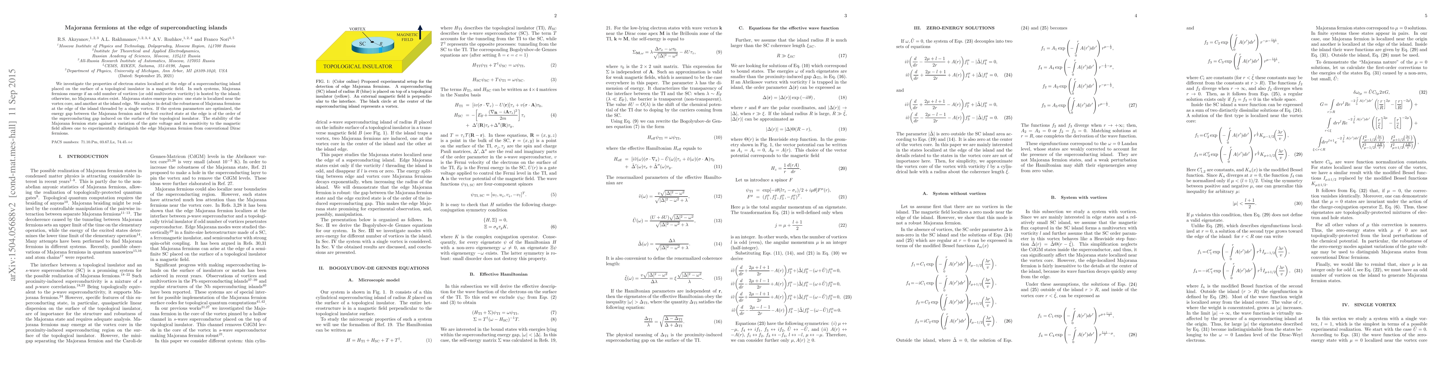 We investigate the properties of electron states localized at the edge of a superconducting island placed on the surface of a topological insulator in a magnetic field. In such systems, Majorana fermions emerge if an odd number of vortices (or odd multivortex vorticity) is hosted by the island; otherwise, no Majorana states exist. Majorana states emerge in pairs: one state is localized near the vortex core, and another at the island edge. We analyze in detail the robustness of Majorana fermions at the edge of the island threaded by a single vortex. If the system parameters are optimized, the energy gap between the Majorana fermion and the first excited state at the edge is of the order of the superconducting gap induced on the surface of the topological insulator. The stability of the Majorana fermion state against a variation of the gate voltage and its sensitivity to the magnetic field allows one to distinguish experimentally the edge Majorana fermion from conventional Dirac fermions.