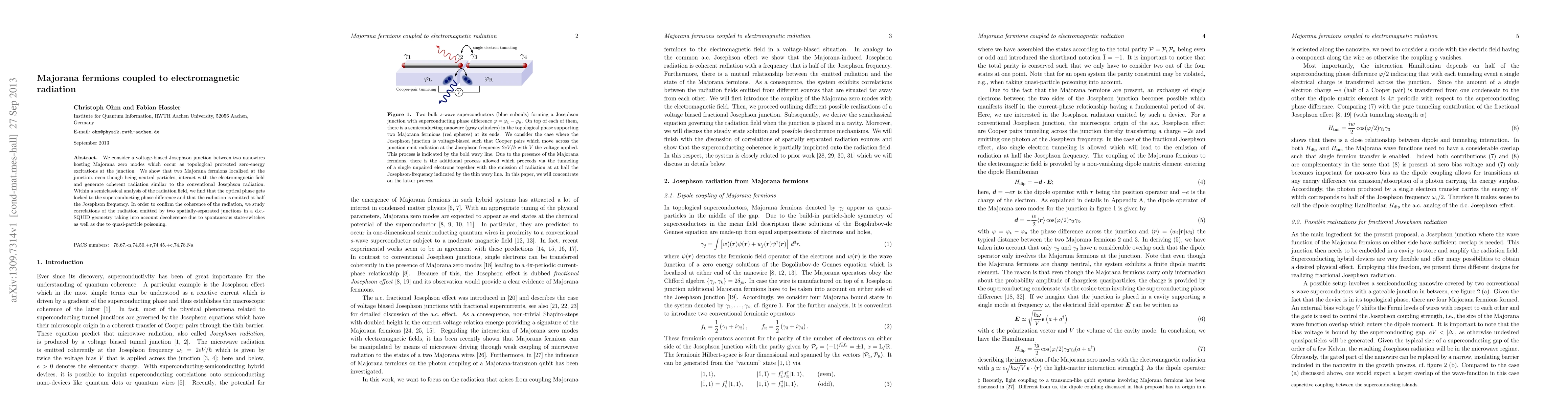 This paper investigates how Majorana fermions in a voltage-biased Josephson junction between nanowires generate coherent electromagnetic radiation at half the Josephson frequency, demonstrating a novel interaction between neutral particles and electromagnetic fields. The study confirms coherence through correlations in radiation from spatially-separated junctions in a d.c.-SQUID geometry, accounting for decoherence effects.