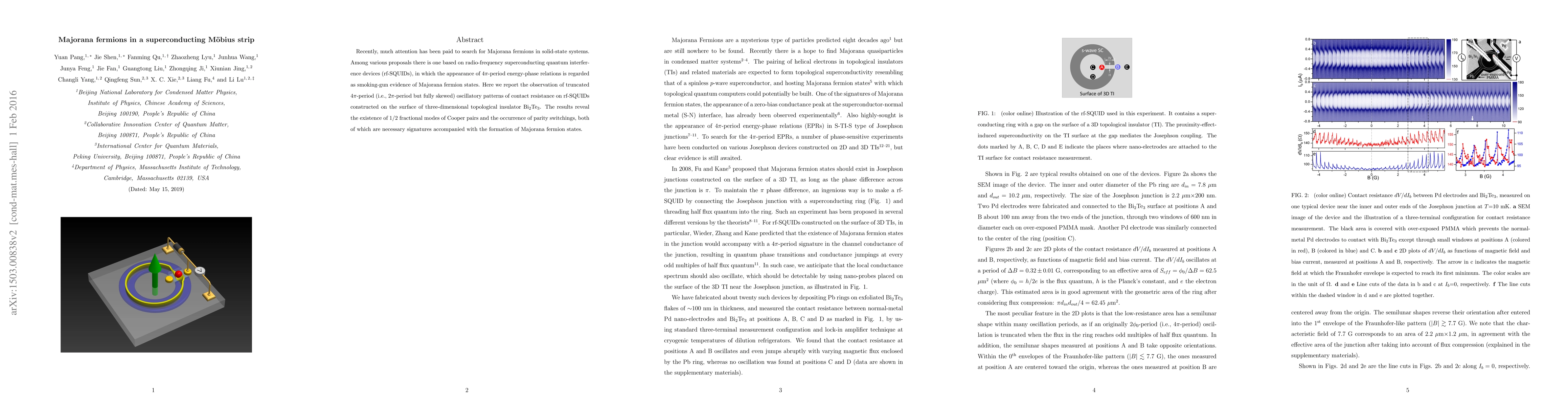 Recently, much attention has been paid to search for Majorana fermions in solid-state systems. Among various proposals there is one based on radio-frequency superconducting quantum interference devices (rf-SQUIDs), in which the appearance of 4$\pi$-period energy-phase relations is regarded as smoking-gun evidence of Majorana fermion states. Here we report the observation of truncated 4$\pi$-period (i.e., 2$\pi$-period but fully skewed) oscillatory patterns of contact resistance on rf-SQUIDs constructed on the surface of three-dimensional topological insulator Bi$_2$Te$_3$. The results reveal the existence of 1/2 fractional modes of Cooper pairs and the occurrence of parity switchings, both of which are necessary signatures accompanied with the formation of Majorana fermion states.
