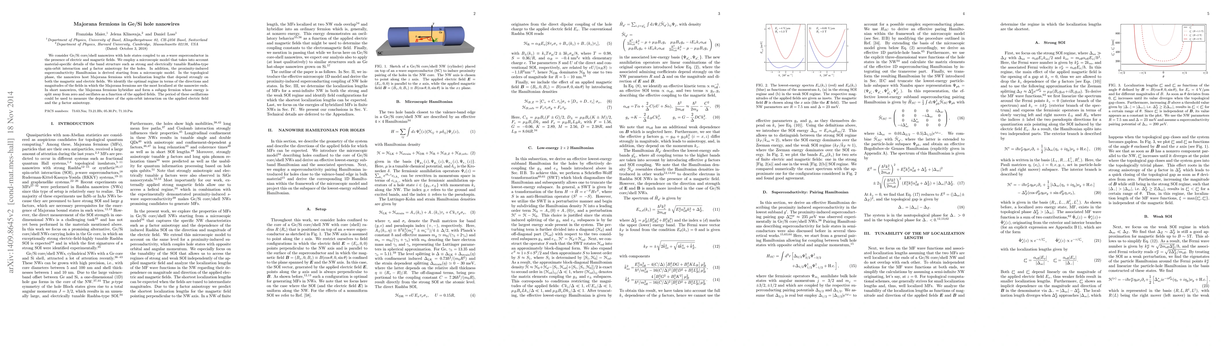 We consider Ge/Si core/shell nanowires with hole states coupled to an $s$-wave superconductor in the presence of electric and magnetic fields. We employ a microscopic model that takes into account material-specific details of the band structure such as strong and electrically tunable Rashba-type spin-orbit interaction and $g$ factor anisotropy for the holes. In addition, the proximity-induced superconductivity Hamiltonian is derived starting from a microscopic model. In the topological phase, the nanowires host Majorana fermions with localization lengths that depend strongly on both the magnetic and electric fields. We identify the optimal regime in terms of the directions and magnitudes of the fields in which the Majorana fermions are the most localized at the nanowire ends. In short nanowires, the Majorana fermions hybridize and form a subgap fermion whose energy is split away from zero and oscillates as a function of the applied fields. The period of these oscillations could be used to measure the dependence of the spin-orbit interaction on the applied electric field and the $g$ factor anisotropy.