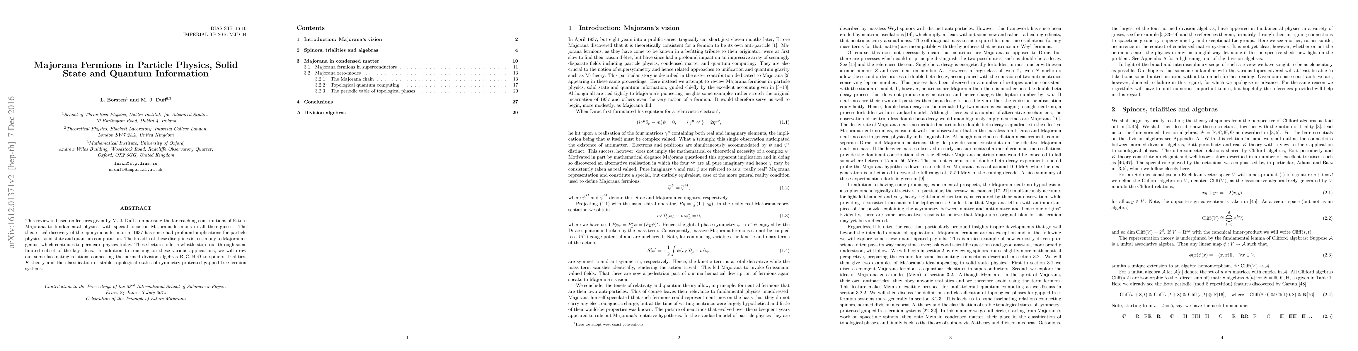 This review is based on lectures given by M. J. Duff summarising the far reaching contributions of Ettore Majorana to fundamental physics, with special focus on Majorana fermions in all their guises. The theoretical discovery of the eponymous fermion in 1937 has since had profound implications for particle physics, solid state and quantum computation. The breadth of these disciplines is testimony to Majorana's genius, which continues to permeate physics today. These lectures offer a whistle-stop tour through some limited subset of the key ideas. In addition to touching on these various applications, we will draw out some fascinating relations connecting the normed division algebras $\mathbb{R}, \mathbb{C}, \mathbb{H}, \mathbb{O}$ to spinors, trialities, $K$-theory and the classification of stable topological states of symmetry-protected gapped free-fermion systems.