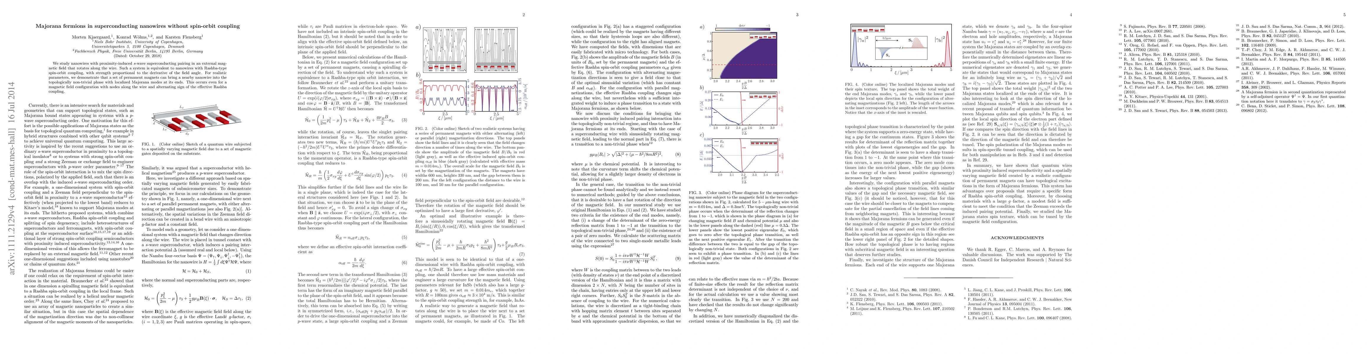 We show that confined Majorana fermions can exist in nanowires with proximity induced s-wave superconducting pairing if the direction of an external magnetic field rotates along the wire. The system is equivalent to nanowires with Rashba-type spin-orbit coupling, with strength proportional to the derivative of the field angle. For realistic parameters, we demonstrate that a set of permanent magnets can bring a nearby nanowire into the topologically non-trivial phase with localized Majorana modes at its ends. Without the requirement of spin-orbit coupling this opens up for a new route for demonstration and design of Majorana fermion systems.