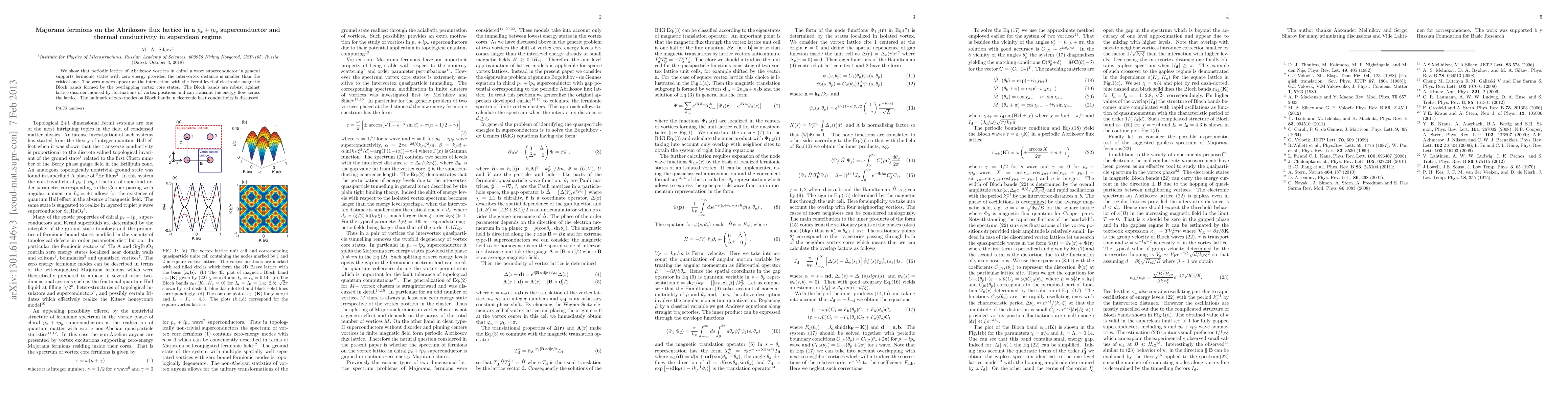We show that periodic lattice of Abrikosov vortices in chiral $p$ wave superconductor in general supports fermionic states with zero energy provided the intervortex distance is smaller than the critical one. The zero modes appear at the intersection with the Fermi level of electronic magnetic Bloch bands formed by the overlapping vortex core states. The Bloch bands are robust against lattice disorder induced by fluctuations of vortex positions and can transmit the energy flow across the lattice. The hallmark of zero modes on Bloch bands in electronic heat conductivity is discussed.