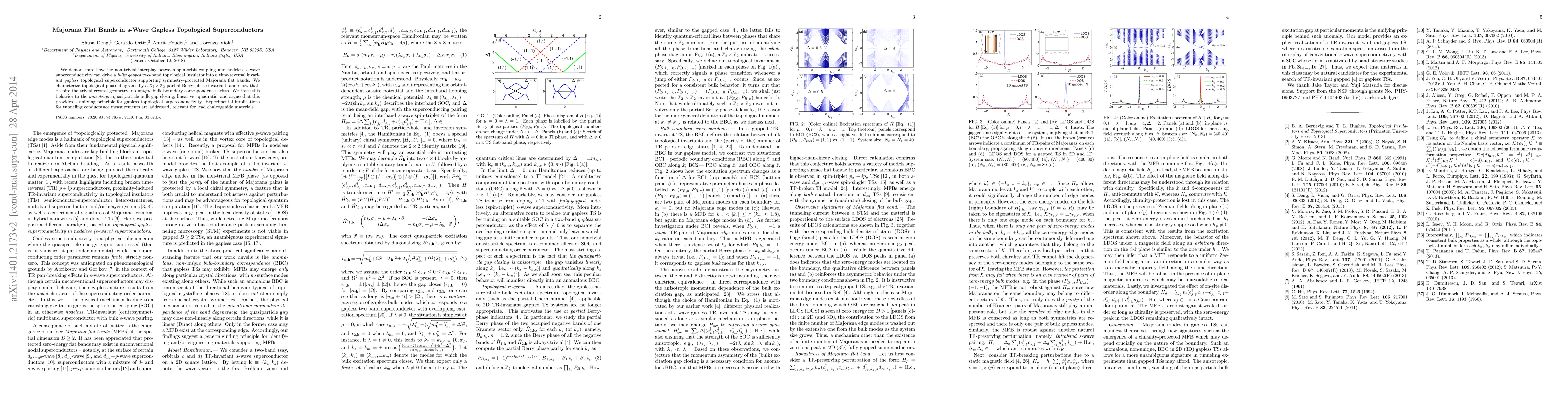 This paper explores how spin-orbit coupling and nodeless $s$-wave superconductivity can transform a gapped topological insulator into a gapless topological superconductor with Majorana flat bands, characterized by a ${\mathbb Z}_2 \times{\mathbb Z}_2$ invariant. It argues that the absence of a unique bulk-boundary correspondence is due to anisotropic quasiparticle bulk gap closing, with implications for tunneling conductance in lead chalcogenide materials.