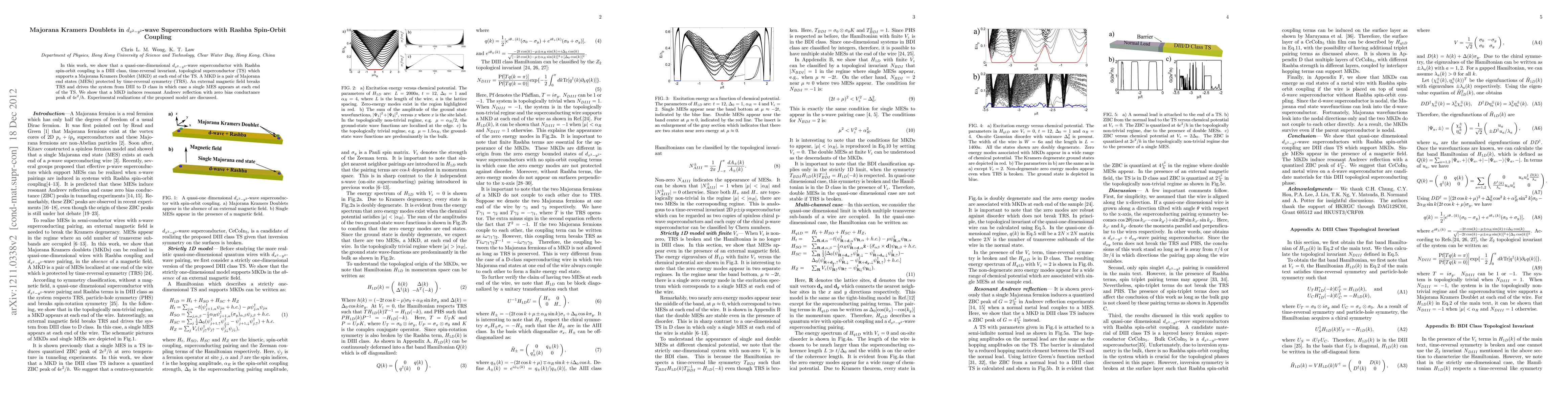 This paper demonstrates that a quasi-one-dimensional $d_{x^2-y^2}$-wave superconductor with Rashba spin-orbit coupling is a topological superconductor supporting Majorana Kramers Doublets at each end, which exhibit a zero-bias conductance peak. The system transitions to a non-topological state under an external magnetic field.