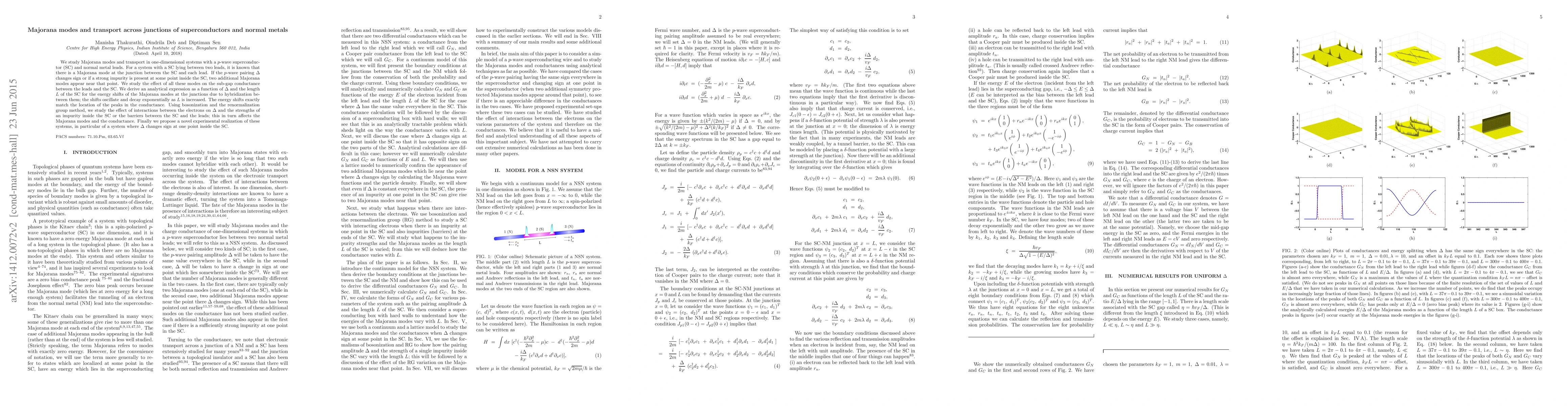 We study Majorana modes and transport in one-dimensional systems with a $p$-wave superconductor (SC) and normal metal leads. For a system with a SC lying between two leads, it is known that there is a Majorana mode at the junction between the SC and each lead. If the $p$-wave pairing $\Delta$ changes sign or if a strong impurity is present at some point inside the SC, two additional Majorana modes appear near that point. We study the effect of all these modes on the sub-gap conductance between the leads and the SC. We derive an analytical expression as a function of $\Delta$ and the length $L$ of the SC for the energy shifts of the Majorana modes at the junctions due to hybridization between them; the shifts oscillate and decay exponentially as $L$ is increased. The energy shifts exactly match the location of the peaks in the conductance. Using bosonization and the renormalization group method, we study the effect of interactions between the electrons on $\Delta$ and the strengths of an impurity inside the SC or the barriers between the SC and the leads; this in turn affects the Majorana modes and the conductance. Finally we propose a novel experimental realization of these systems, in particular of a system where $\Delta$ changes sign at one point inside the SC.