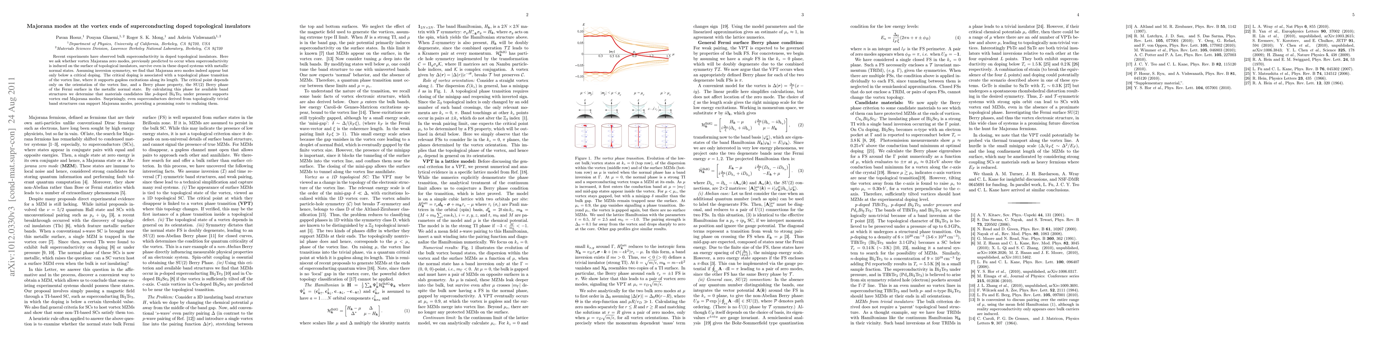 Recent experiments have observed bulk superconductivity in doped topological insulators. Here we ask whether vortex Majorana zero modes, previously predicted to occur when superconductivity is induced on the surface of topological insulators, survive even in these doped systems with metallic normal states. Assuming inversion symmetry, we find that Majorana zero modes indeed appear but only below a critical doping. The critical doping is associated with a topological phase transition of the vortex line, where it supports gapless excitations along its length. The critical point depends only on the orientation of the vortex line, and a Berry phase property, the SU(2) Berry phase of the Fermi surface in the metallic normal state. By calculating this phase for available band structures we determine that materials candidates like $p$-doped Bi$_{2}$Te$_{3}$ under pressure supports vortex end Majorana modes. Surprisingly, even superconductors derived from topologically trivial band structures can support Majorana modes, providing a promising route to realizing them.