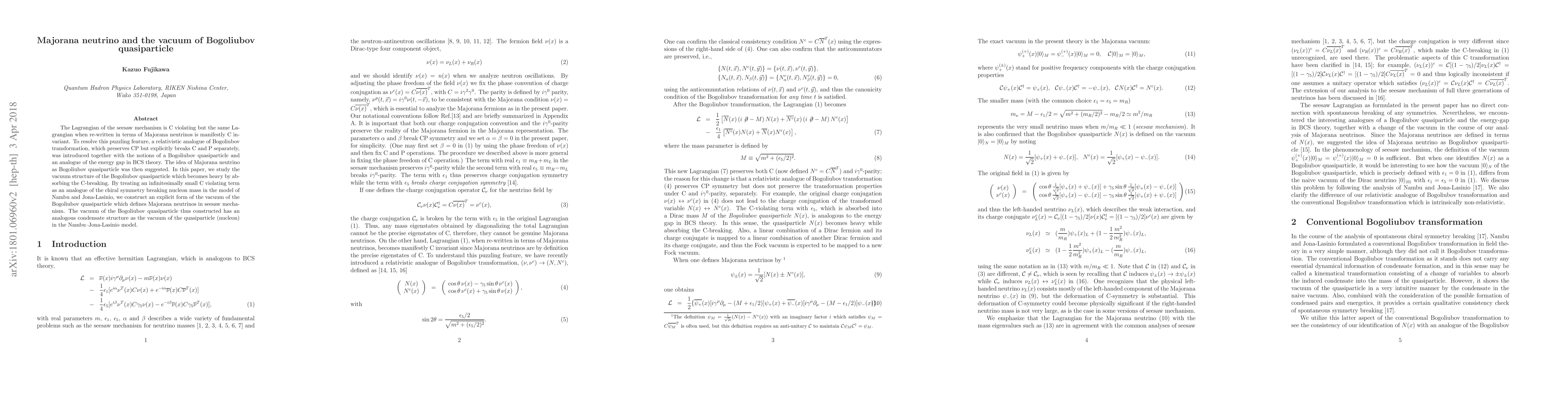 This paper explores the vacuum structure of Majorana neutrinos modeled as Bogoliubov quasiparticles, resolving the C-violation paradox in the seesaw mechanism by introducing a relativistic Bogoliubov transformation. It constructs an explicit vacuum form analogous to the Nambu-Jona-Lasinio model, revealing a condensate structure.