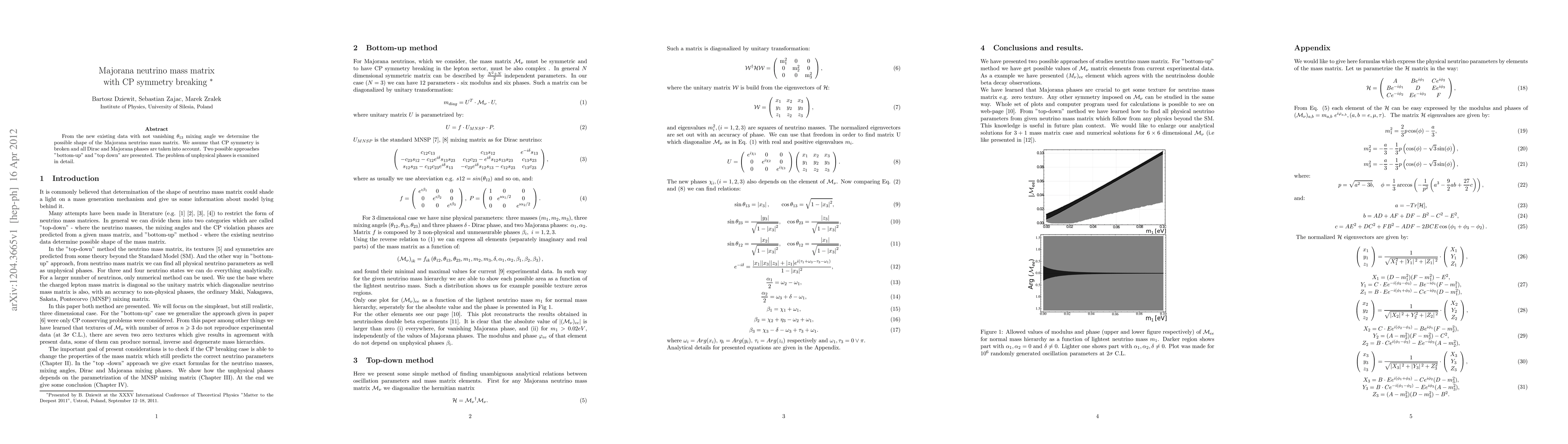 From the new existing data with not vanishing theta13 mixing angle we determine the possible shape of the Majorana neutrino mass matrix. We assume that CP symmetry is broken and all Dirac and Majorana phases are taken into account. Two possible approaches "bottom-up" and "top down" are presented. The problem of unphysical phases is examined in detail.