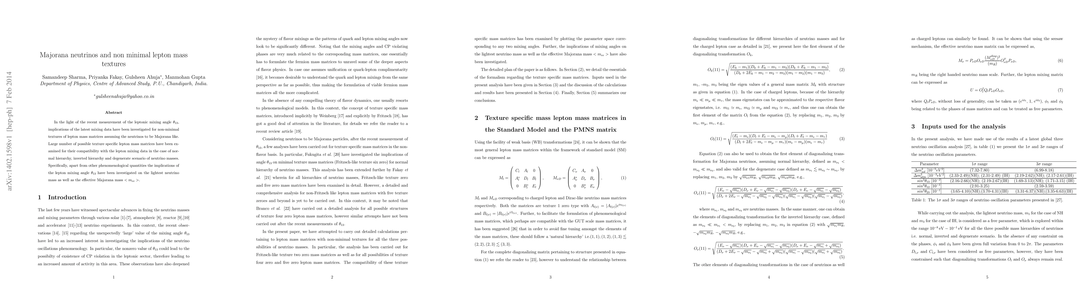 The research investigates non-minimal textures of lepton mass matrices assuming Majorana neutrinos, examining compatibility with recent leptonic mixing data for normal hierarchy, inverted hierarchy, and degenerate scenarios of neutrino masses.