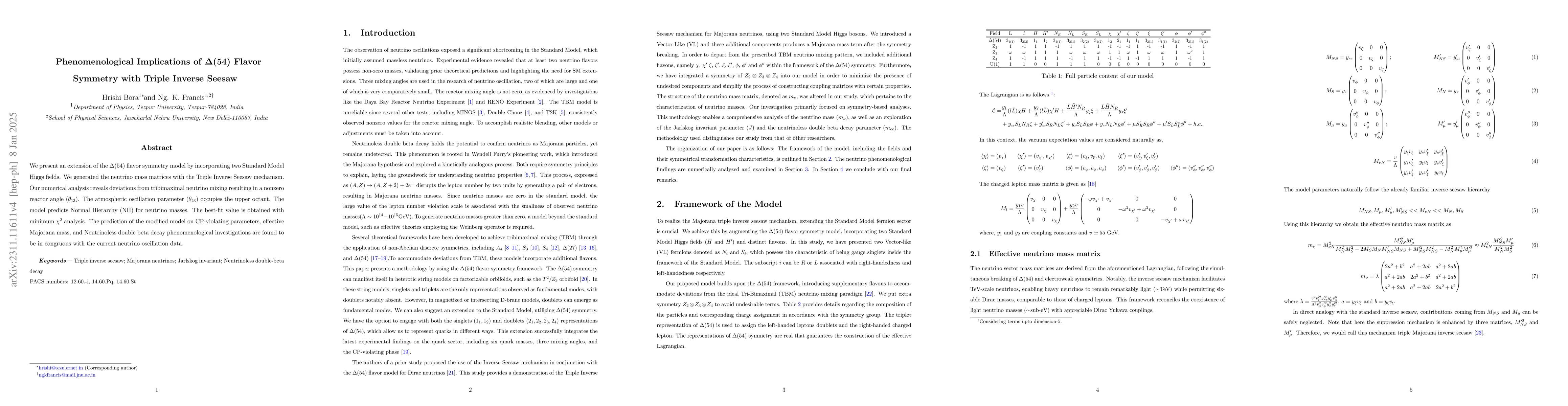 This study combines $\Delta$(54) flavor symmetry with the Double Inverse Seesaw mechanism to explore Majorana neutrinos, introducing vector-like and Weyl fermions. The model allows for a non-zero reactor angle $\theta_{13}$ and predicts the atmospheric oscillation parameter $\theta_{23}$ in the upper octant, while analyzing CP violation, Jarlskog invariant, and neutrinoless double-beta decay parameters to align with recent neutrino observations.