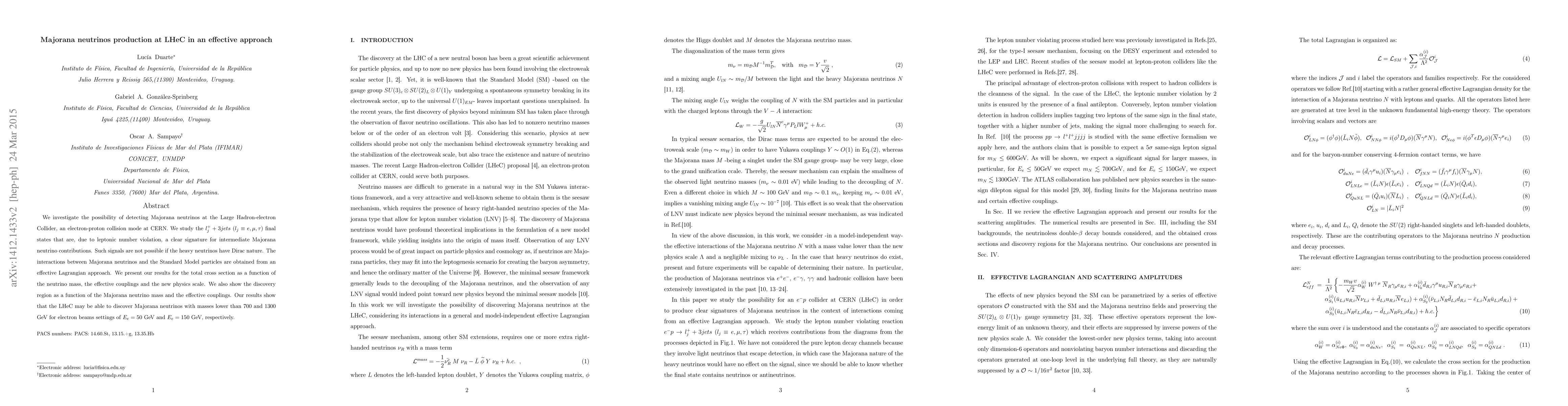 This paper explores the potential for detecting Majorana neutrinos at the LHeC using electron-proton collisions, focusing on $l_j^{+} + 3 jets$ final states as a signature of leptonic number violation. The study employs an effective Lagrangian approach to model interactions and finds that the LHeC could discover Majorana neutrinos with masses below $700$ GeV and $1300$ GeV for electron beam energies of $50$ GeV and $150$ GeV, respectively.