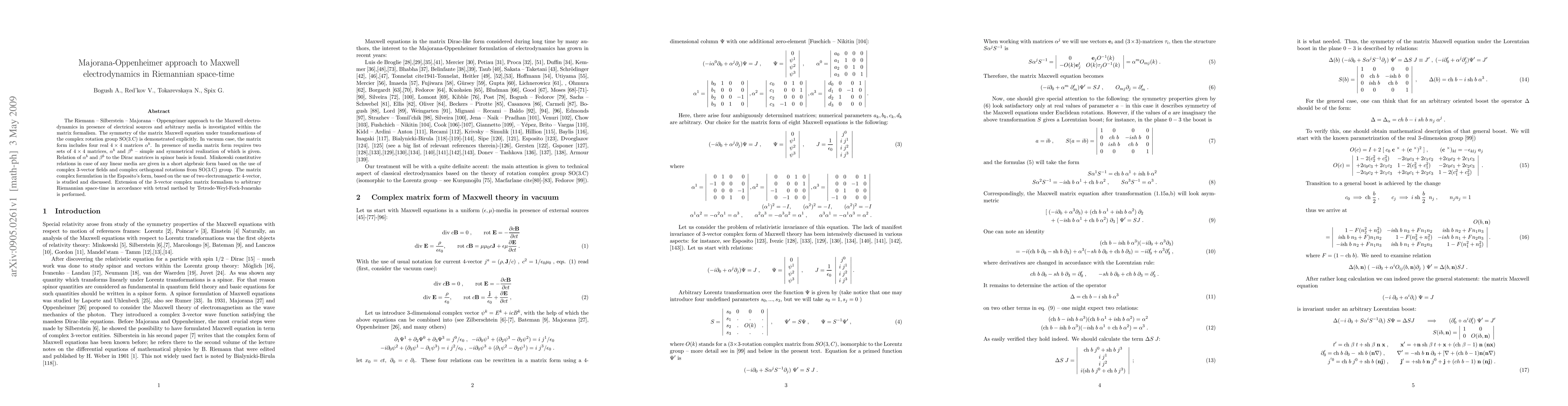 This paper explores the Riemann-Silberstein-Majorana-Oppenheimer approach to Maxwell electrodynamics in Riemannian space-time using matrix formalism, demonstrating the symmetry under complex rotation group transformations. It extends the matrix formulation to include media and relates matrices to Dirac matrices, providing a concise algebraic form for Minkowski constitutive relations in linear media.