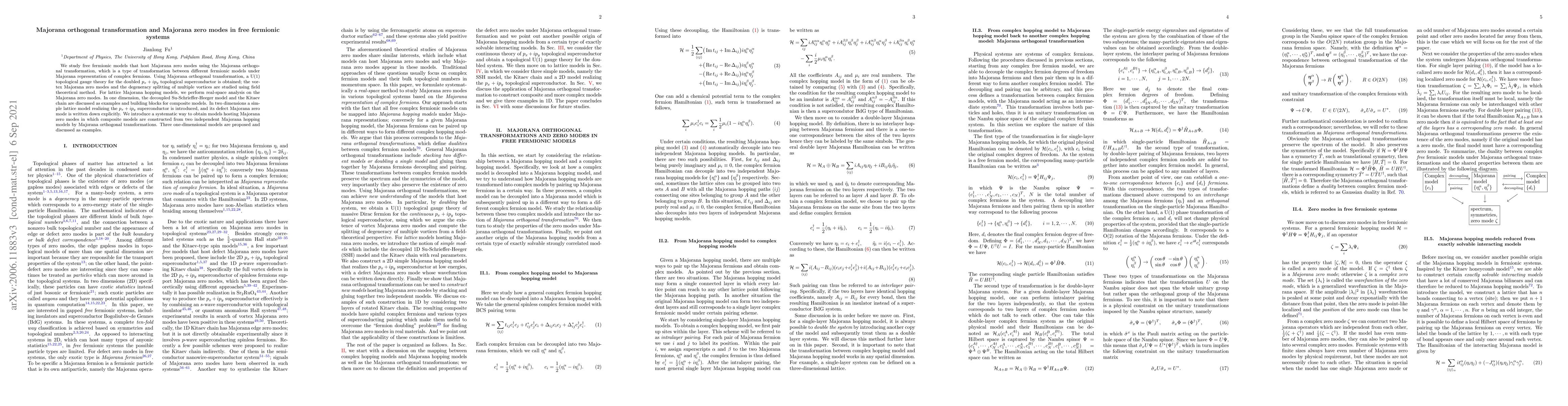 We study free fermionic models that host Majorana zero modes using the Majorana orthogonal transformation, which is a type of transformation between different fermionic models under Majorana representation of complex fermions. Using Majorana orthogonal transformation, a U(1) topological gauge theory for the doubled $p_{x}+ip_{y}$ topological superconductor is obtained; the vortex Majorana zero modes and the degeneracy splitting of multiple vortices are studied using field theoretical method. For lattice Majorana hopping models, we perform real-space analysis on the Majorana zero modes. In one dimension, the decoupled Su-Schrieffer-Heeger model and the Kitaev chain are discussed as examples and building blocks for composite models. In two dimensions a simple lattice model realizing the $p_{x}+ip_{y}$ superconductor is introduced, and its defect Majorana zero mode is written down explicitly. We introduce a systematic way to obtain models hosting Majorana zero modes in which composite models are constructed from two independent Majorana hopping models by Majorana orthogonal transformations. Three one-dimensional models are proposed and discussed as examples.