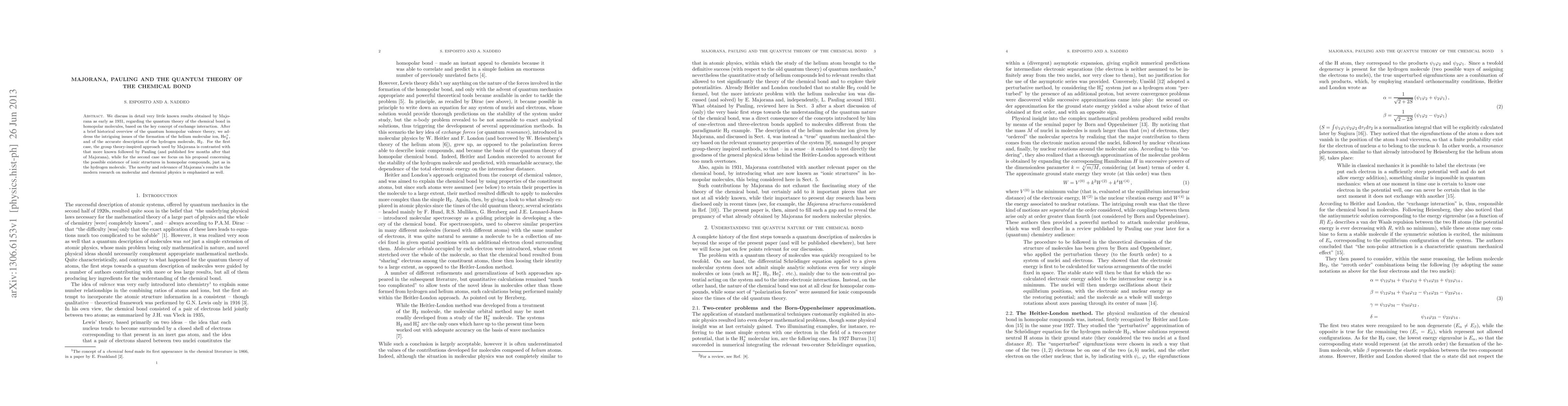 This paper explores Majorana's early 1931 quantum theory of the chemical bond, focusing on the exchange interaction in homopolar molecules. It contrasts Majorana's group theory-based approach with Pauling's more famous method, highlighting Majorana's insights on the helium molecular ion and ionic structures in hydrogen molecules.