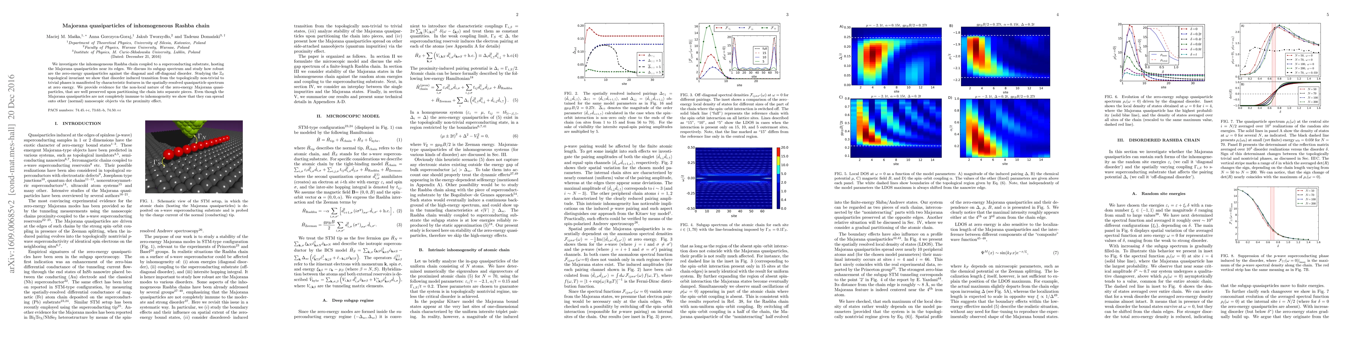We investigate the inhomogeneous Rashba chain coupled to a superconducting substrate, hosting the Majorana quasiparticles near its edges. We discuss its subgap spectrum and study how robust are the zero-energy quasiparticles against the diagonal and off-diagonal disorder. Studying the $\mathbb{Z}_2$ topological invariant we show that disorder induced transition from the topologically non-trivial to trivial phases is manifested by characteristic features in the spatially-resolved quasiparticle spectrum at zero energy. We provide evidence for the non-local nature of the zero-energy Majorana quasiparticles, that are well preserved upon partitioning the chain into separate pieces. Even though the Majorana quasiparticles are not completely immune to inhomogeneity we show that they can spread onto other (normal) nanoscopic objects via the proximity effect.