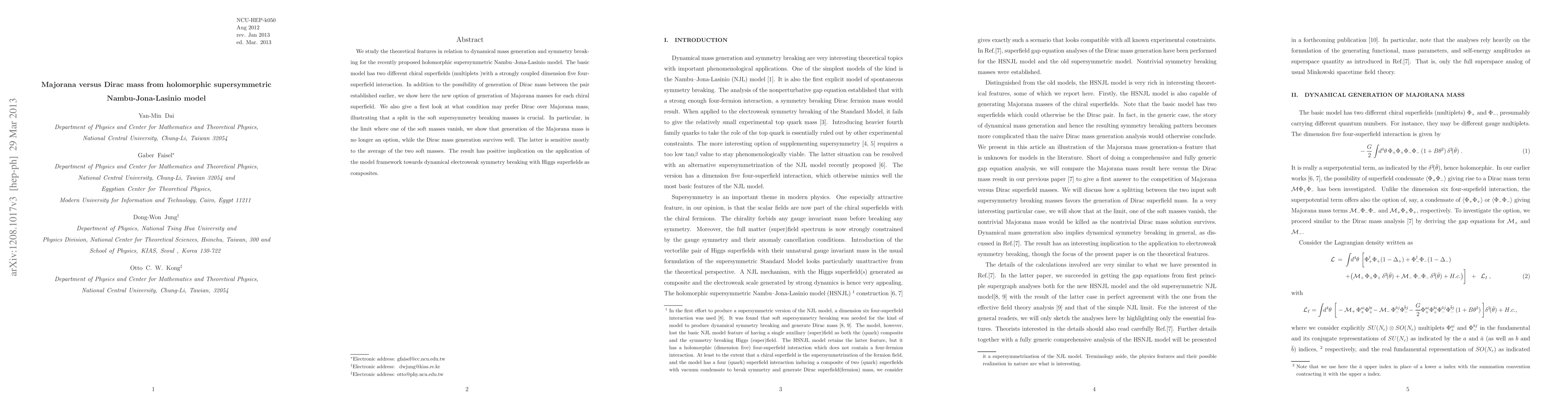 We study the theoretical features in relation to dynamical mass generation and symmetry breaking for the recently proposed holomorphic supersymmetric Nambu--Jona-Lasinio model. The basic model has two different chiral superfields (multiplets) with a strongly coupled dimension five four-superfield interaction. In addition to the possibility of generation of Dirac mass between the pair established earlier, we show here the new option of generation of Majorana masses for each chiral superfield. We also give a first look at what condition may prefer Dirac over Majorana mass, illustrating that a split in the soft supersymmetry breaking masses is crucial. In particular, in the limit where one of the soft masses vanish, we show that generation of the Majorana mass is no longer an option, while the Dirac mass generation survives well. The latter is sensitive mostly to the average of the two soft masses. The result has positive implication on the application of the model framework towards dynamical electroweak symmetry breaking with Higgs superfields as composites.