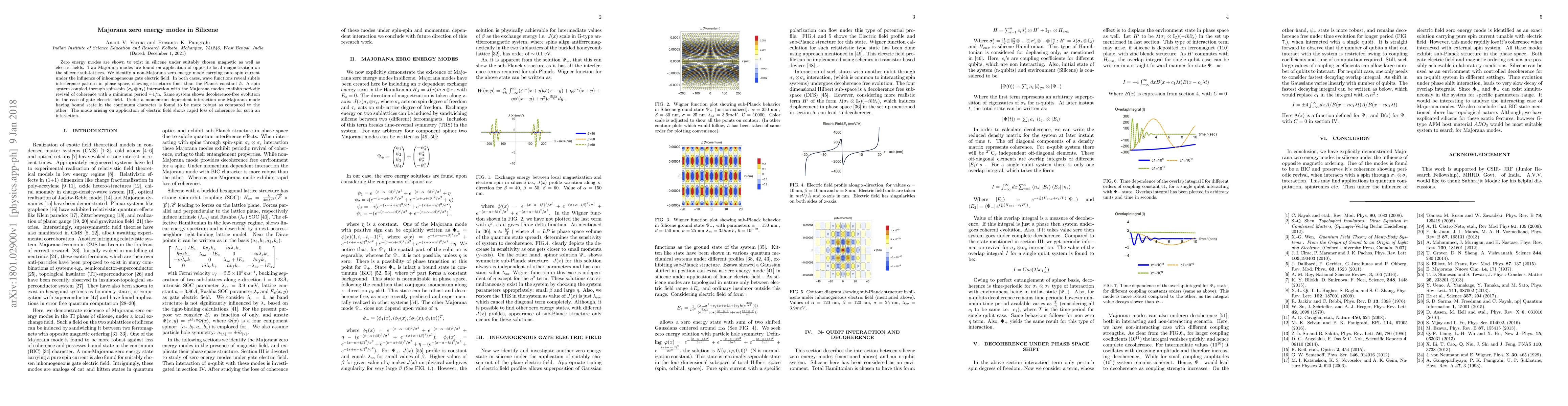 Research shows the existence of zero energy Majorana modes in silicene under magnetic and electric fields, with one mode demonstrating robustness and another showing rapid coherence loss under specific interactions. The wave functions exhibit intricate interference patterns finer than the Planck constant.