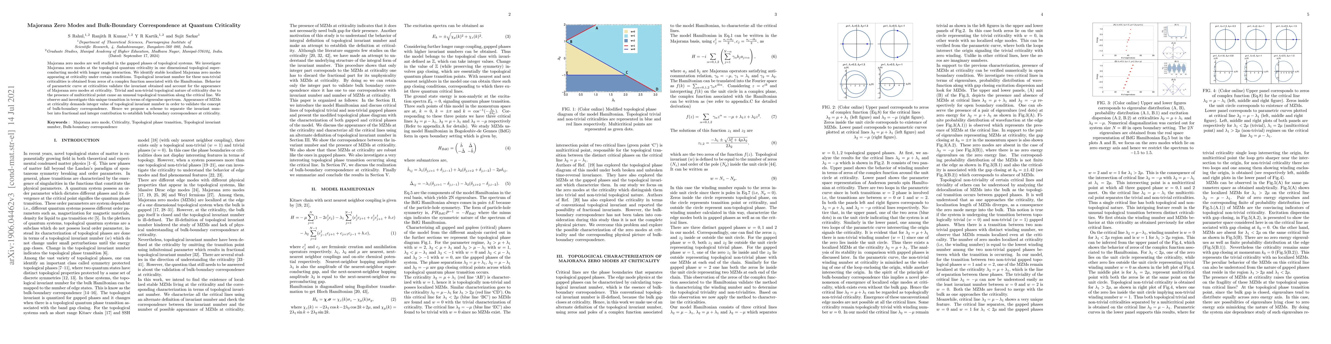 Majorana zero modes are well studied in the gapped phases of topological systems. We investigate Majorana zero modes at the topological quantum criticality in one dimensional topological superconducting model with longer range interaction. We identify stable localized Majorana zero modes appearing at criticality under certain conditions. Topological invariant number for these non-trivial criticalities is obtained from zeros of a complex function associated with the Hamiltonian. Behavior of parametric curve at criticalities validate the invariant obtained and account for the appearance of Majorana zero modes at criticality. Trivial and non-trivial topological nature of criticality due to the presence of multicritical point cause an unusual topological transition along the critical line. We observe and investigate this unique transition in terms of eigenvalue spectrum. Appearance of MZMs at criticality demands integer value of topological invariant number in order to validate the concept of bulk-boundary correspondence. Hence we propose a scheme to separate the invariant number into fractional and integer contribution to establish bulk-boundary correspondence at criticality.