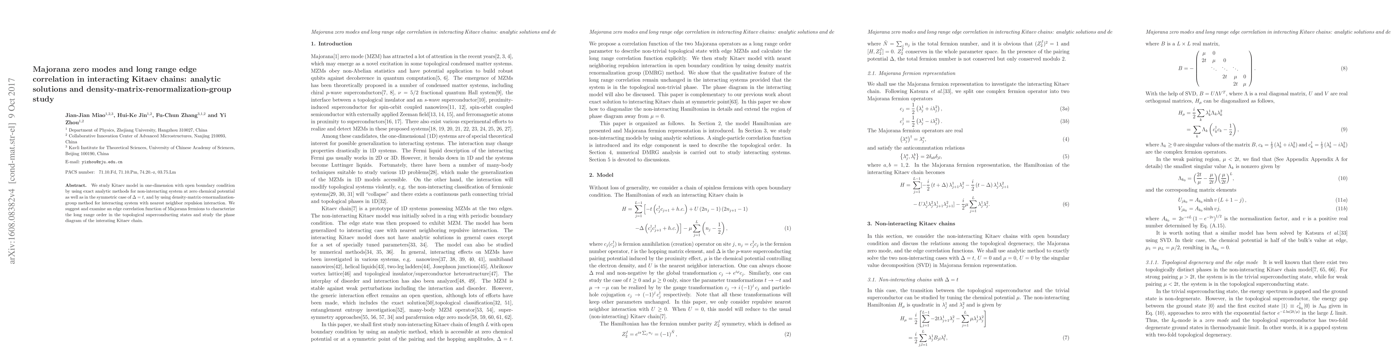We study Kitaev model in one-dimension with open boundary condition by using exact analytic methods for non-interacting system at zero chemical potential as well as in the symmetric case of {\Delta} = t, and by using density-matrix-renormalizationgroup method for interacting system with nearest neighbor repulsion interaction. We suggest and examine an edge correlation function of Majorana fermions to characterize the long range order in the topological superconducting states and study the phase diagram of the interating Kitaev chain.