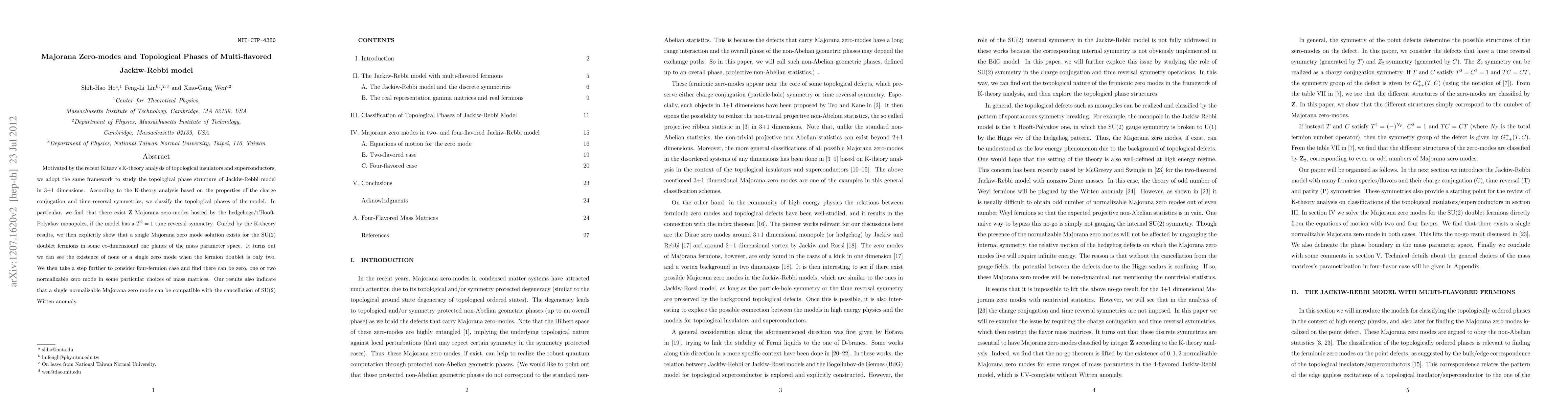 This paper classifies the topological phases of the Jackiw-Rebbi model in 3+1 dimensions using K-theory analysis, revealing the existence of $\mathbf{Z}$ Majorana zero-modes in certain configurations, and demonstrates the compatibility of a single Majorana zero mode with the cancellation of SU(2) Witten anomaly.