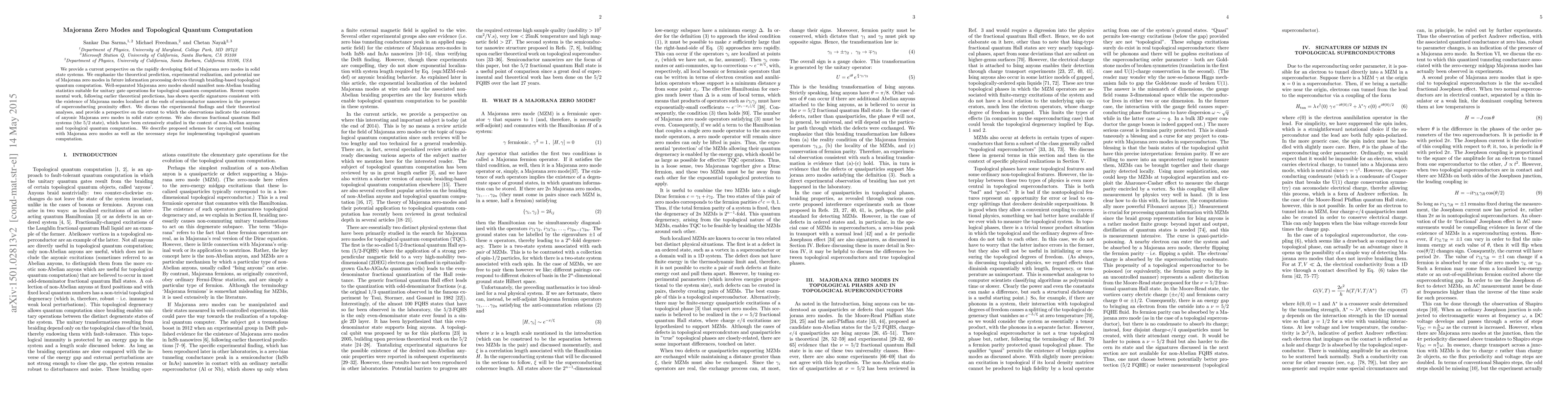 This paper reviews the emerging field of Majorana zero modes in solid-state systems, highlighting their theoretical prediction, experimental realization, and potential for topological quantum computation through braiding. Recent experiments have detected signatures of these modes in semiconductor nanowires under superconducting proximity effects, providing a foundation for future information processing devices.