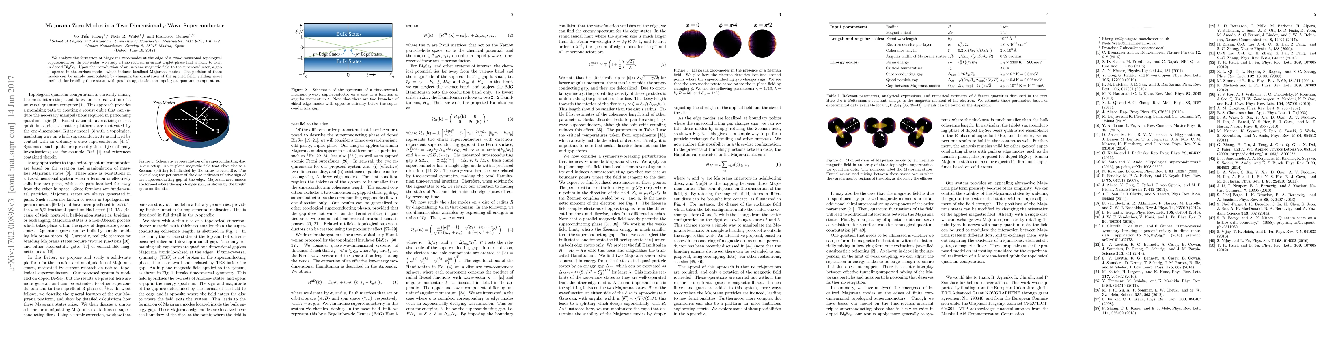 This paper investigates the emergence of Majorana zero-modes at the edge of a two-dimensional $p$-wave superconductor, particularly in doped Bi$_2$Se$_3$, and demonstrates how an in-plane magnetic field can induce and manipulate these localized Majorana modes, offering potential for topological quantum computation.