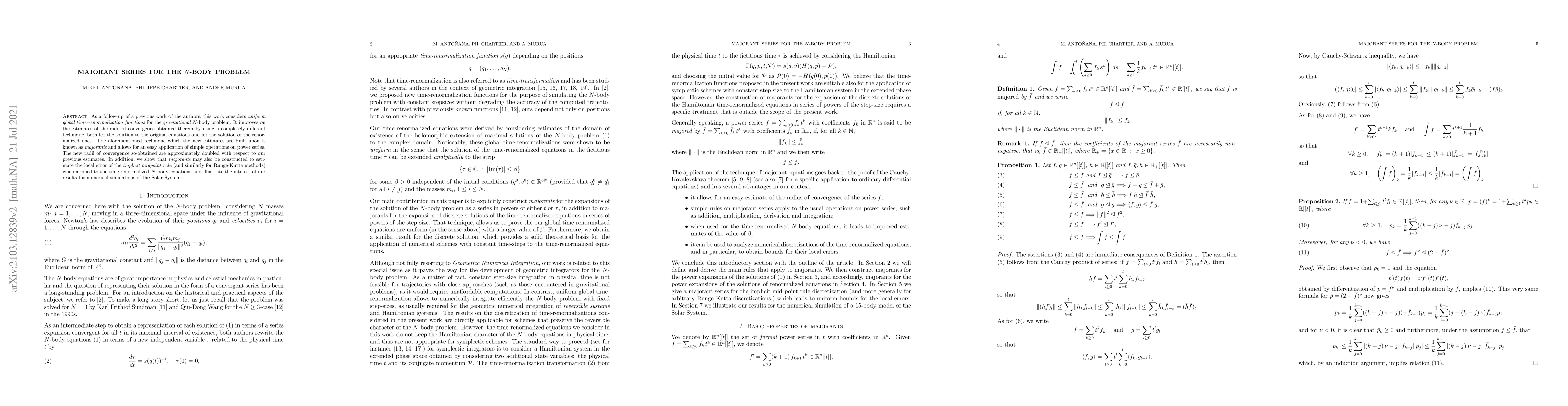 This paper enhances the estimates for the radii of convergence in the gravitational $N$-body problem using a majorant series technique, doubling previous estimates. It also demonstrates the utility of majorants in estimating the local error of numerical methods like the implicit midpoint rule for solving renormalized $N$-body equations.