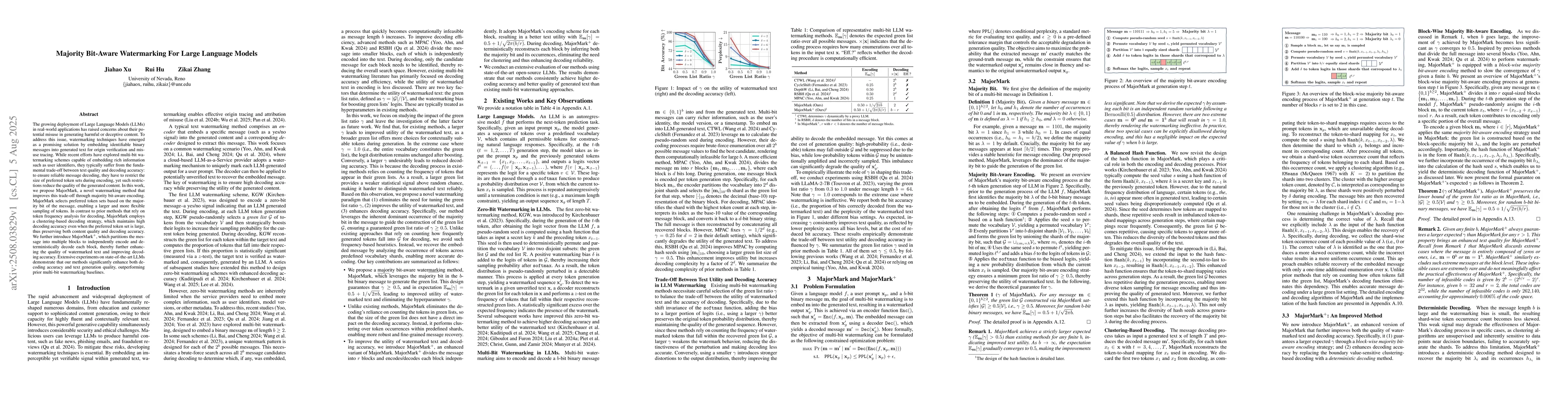 The growing deployment of Large Language Models (LLMs) in real-world applications has raised concerns about their potential misuse in generating harmful or deceptive content. To address this issue, watermarking techniques have emerged as a promising solution by embedding identifiable binary messages into generated text for origin verification and misuse tracing. While recent efforts have explored multi-bit watermarking schemes capable of embedding rich information such as user identifiers, they typically suffer from the fundamental trade-off between text quality and decoding accuracy: to ensure reliable message decoding, they have to restrict the size of preferred token sets during encoding, yet such restrictions reduce the quality of the generated content. In this work, we propose MajorMark, a novel watermarking method that improves this trade-off through majority bit-aware encoding. MajorMark selects preferred token sets based on the majority bit of the message, enabling a larger and more flexible sampling of tokens. In contrast to prior methods that rely on token frequency analysis for decoding, MajorMark employs a clustering-based decoding strategy, which maintains high decoding accuracy even when the preferred token set is large, thus preserving both content quality and decoding accuracy. We further introduce MajorMark$^+$, which partitions the message into multiple blocks to independently encode and deterministically decode each block, thereby further enhancing the quality of watermarked text and improving decoding accuracy. Extensive experiments on state-of-the-art LLMs demonstrate that our methods significantly enhance both decoding accuracy and text generation quality, outperforming prior multi-bit watermarking baselines.