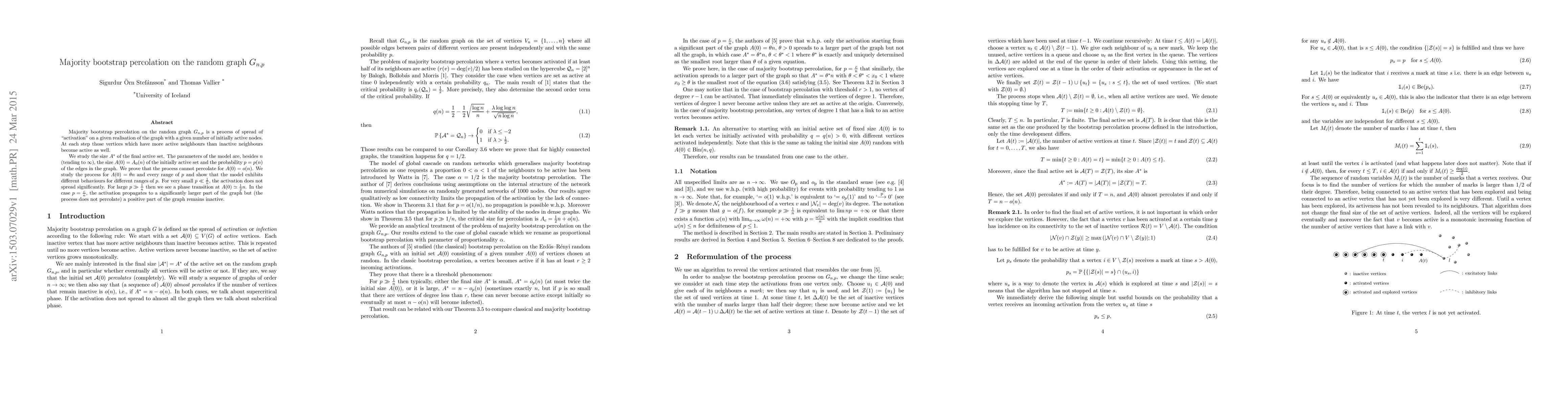 This paper investigates majority bootstrap percolation on the random graph $G_{n,p}$, focusing on the size $A^*$ of the final active set. It demonstrates that the process fails to percolate when the initial active set size $A(0)$ is $o(n)$. For $A(0) = \theta n$, the model exhibits varied behaviors depending on the edge probability $p$, with significant activation spreading only when $p$ is large enough to trigger a phase transition around $A(0) \simeq \frac{1}{2}n$.