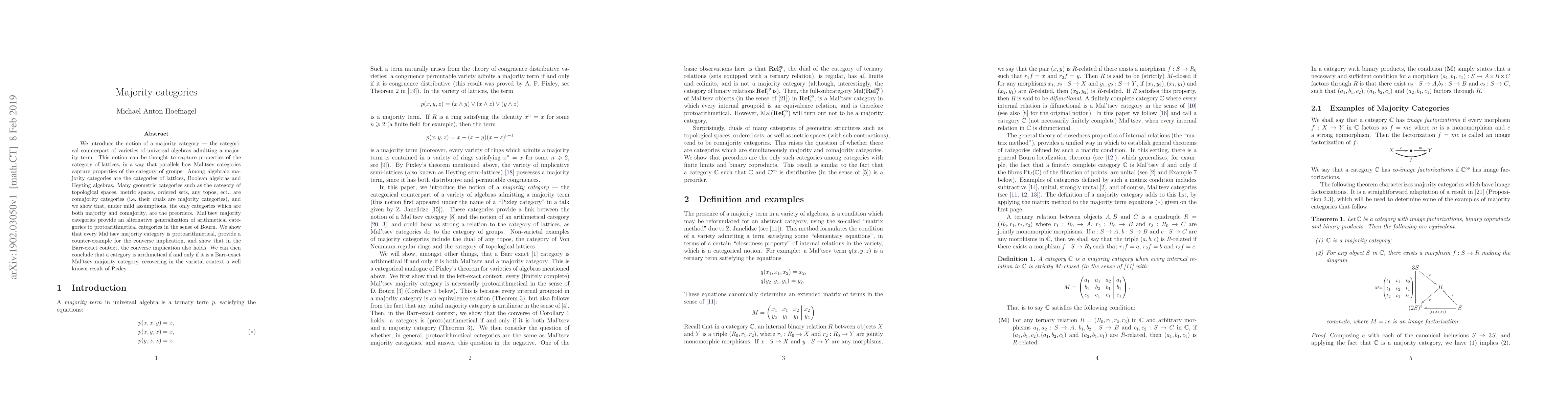 This paper introduces majority categories as a categorical analogue to varieties of universal algebras with a majority term, paralleling how Mal'tsev categories relate to groups. It demonstrates that many geometric categories are comajority categories, and only preorders are both majority and comajority under mild assumptions. It also establishes the relationship between Mal'tsev majority categories and protoarithmetical categories, concluding that a category is arithmetical if and only if it is a Barr-exact Mal'tsev majority category.