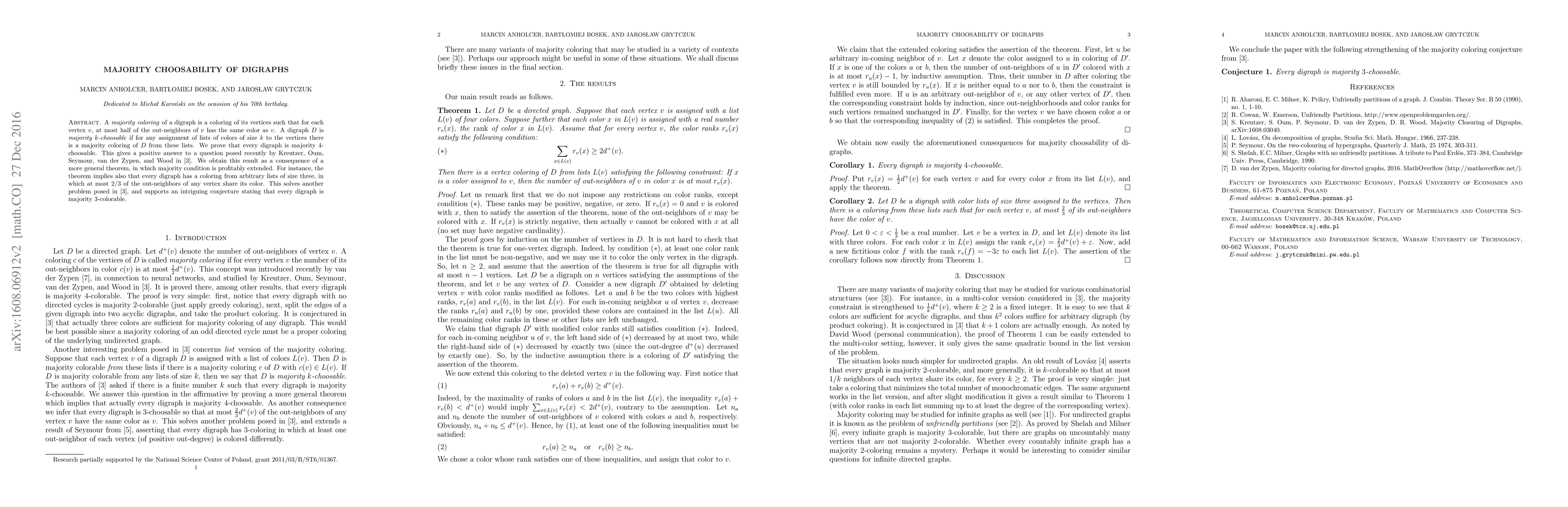 A \emph{majority coloring} of a digraph is a coloring of its vertices such that for each vertex $v$, at most half of the out-neighbors of $v$ has the same color as $v$. A digraph $D$ is \emph{majority $k$-choosable} if for any assignment of lists of colors of size $k$ to the vertices there is a majority coloring of $D$ from these lists. We prove that every digraph is majority $4$-choosable. This gives a positive answer to a question posed recently by Kreutzer, Oum, Seymour, van der Zypen, and Wood in \cite{Kreutzer}. We obtain this result as a consequence of a more general theorem, in which majority condition is profitably extended. For instance, the theorem implies also that every digraph has a coloring from arbitrary lists of size three, in which at most $2/3$ of the out-neighbors of any vertex share its color. This solves another problem posed in \cite{Kreutzer}, and supports an intriguing conjecture stating that every digraph is majority $3$-colorable.