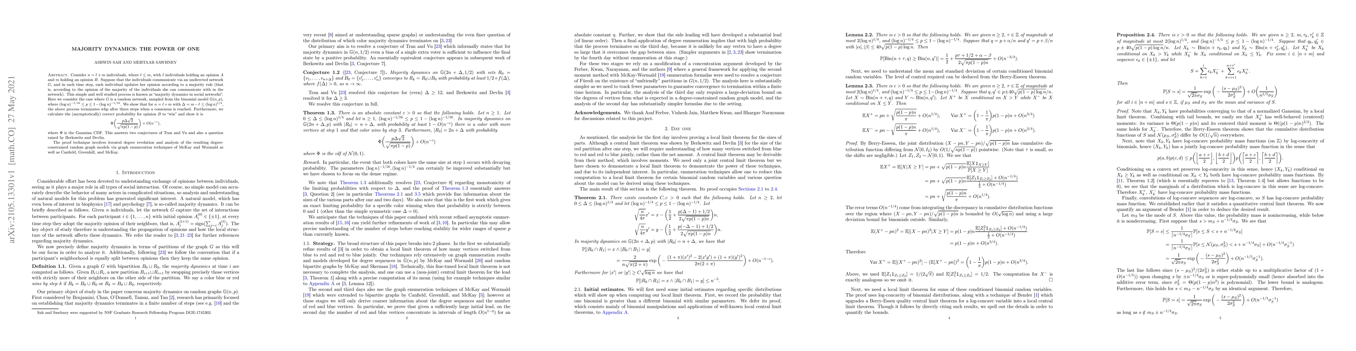 Consider $n=\ell+m$ individuals, where $\ell\le m$, with $\ell$ individuals holding an opinion $A$ and $m$ holding an opinion $B$. Suppose that the individuals communicate via an undirected network $G$, and in each time step, each individual updates her opinion according to a majority rule (that is, according to the opinion of the majority of the individuals she can communicate with in the network). This simple and well studied process is known as "majority dynamics in social networks". Here we consider the case where $G$ is a random network, sampled from the binomial model $\mathbb{G}(n,p)$, where $(\log n)^{-1/16}\le p\le 1-(\log n)^{-1/16}$. We show that for $n=\ell+m$ with $\Delta=m-\ell\le(\log n)^{1/4}$, the above process terminates whp after three steps when a consensus is reached. Furthermore, we calculate the (asymptotically) correct probability for opinion $B$ to "win" and show it is \[\Phi\bigg(\frac{p\Delta\sqrt{2}}{\sqrt{\pi p(1-p)}}\bigg) + O(n^{-c}),\] where $\Phi$ is the Gaussian CDF. This answers two conjectures of Tran and Vu and also a question raised by Berkowitz and Devlin. The proof technique involves iterated degree revelation and analysis of the resulting degree-constrained random graph models via graph enumeration techniques of McKay and Wormald as well as Canfield, Greenhill, and McKay.