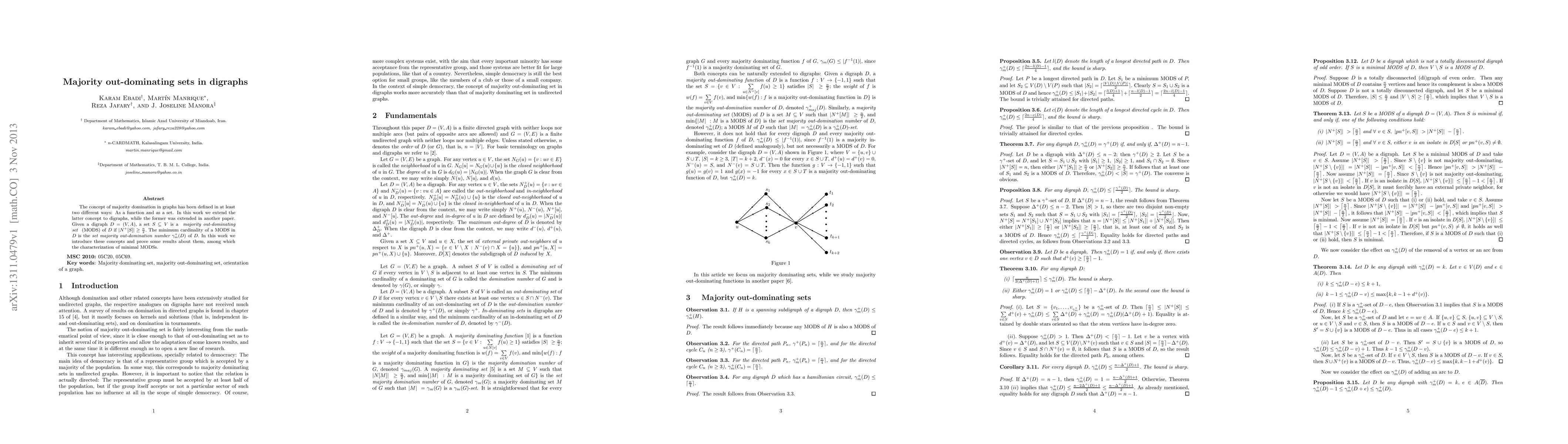 This paper introduces the concept of majority out-dominating sets (MODS) in digraphs, where a set $S$ is a MODS if it out-dominates at least half the vertices. The study characterizes minimal MODS and explores the set majority out-domination number $\gamma^+_{m}(D).$