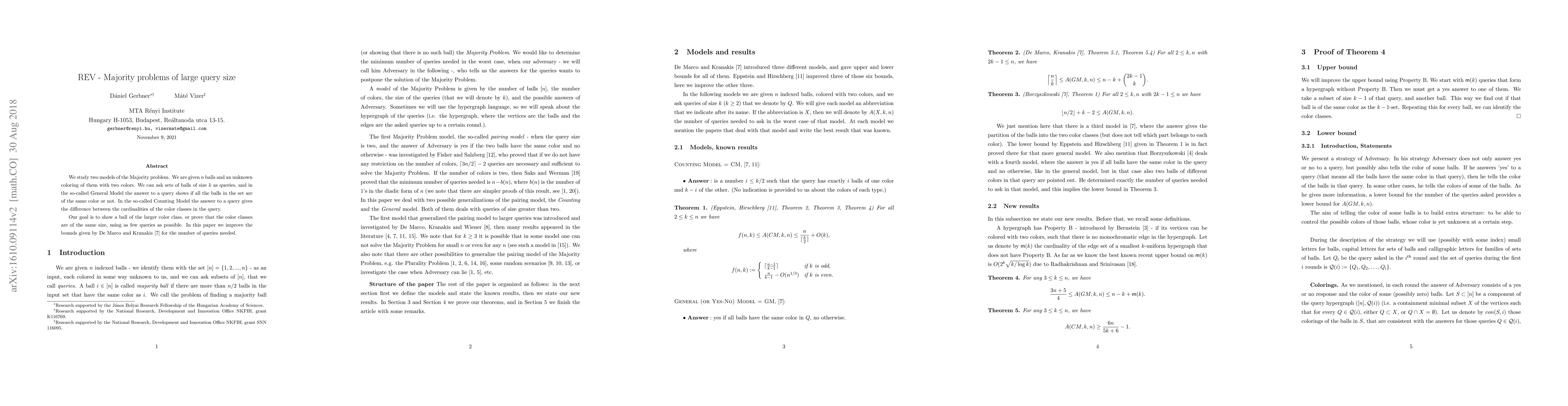The paper analyzes two models of the Majority problem, where n balls are colored with two colors, and queries of size k are used to determine a majority color. In the General Model, queries reveal if all balls in the query are of the same color. In the Counting Model, queries provide the difference in color class sizes.