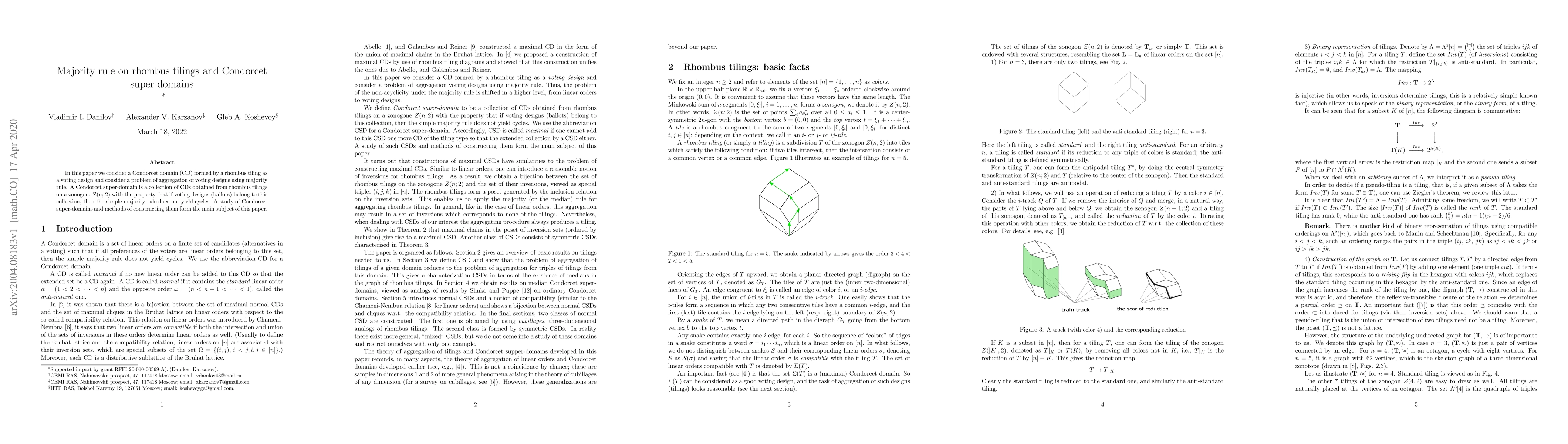 In this paper we consider a Condorcet domain (CD) formed by a rhombus tiling as a voting design and consider a problem of aggregation of voting designs using majority rule. A Condorcet super-domain is a collection of CDs obtained from rhombus tilings on a zonogone Z(n; 2) with the property that if voting designs (ballots) belong to this collection, then the simple majority rule does not yield cycles. A study of Condorcet super-domains and methods of constructing them form the main subject of this paper.