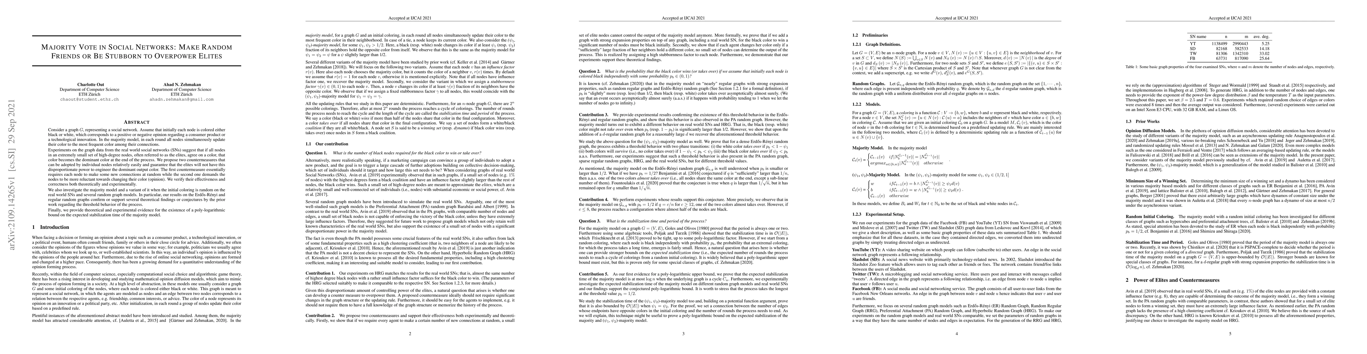 Consider a graph $G$, representing a social network. Assume that initially each node is colored either black or white, which corresponds to a positive or negative opinion regarding a consumer product or a technological innovation. In the majority model, in each round all nodes simultaneously update their color to the most frequent color among their connections. Experiments on the graph data from the real world social networks (SNs) suggest that if all nodes in an extremely small set of high-degree nodes, often referred to as the elites, agree on a color, that color becomes the dominant color at the end of the process. We propose two countermeasures that can be adopted by individual nodes relatively easily and guarantee that the elites will not have this disproportionate power to engineer the dominant output color. The first countermeasure essentially requires each node to make some new connections at random while the second one demands the nodes to be more reluctant towards changing their color (opinion). We verify their effectiveness and correctness both theoretically and experimentally. We also investigate the majority model and a variant of it when the initial coloring is random on the real world SNs and several random graph models. In particular, our results on the Erd\H{o}s-R\'{e}nyi and regular random graphs confirm or support several theoretical findings or conjectures by the prior work regarding the threshold behavior of the process. Finally, we provide theoretical and experimental evidence for the existence of a poly-logarithmic bound on the expected stabilization time of the majority model.