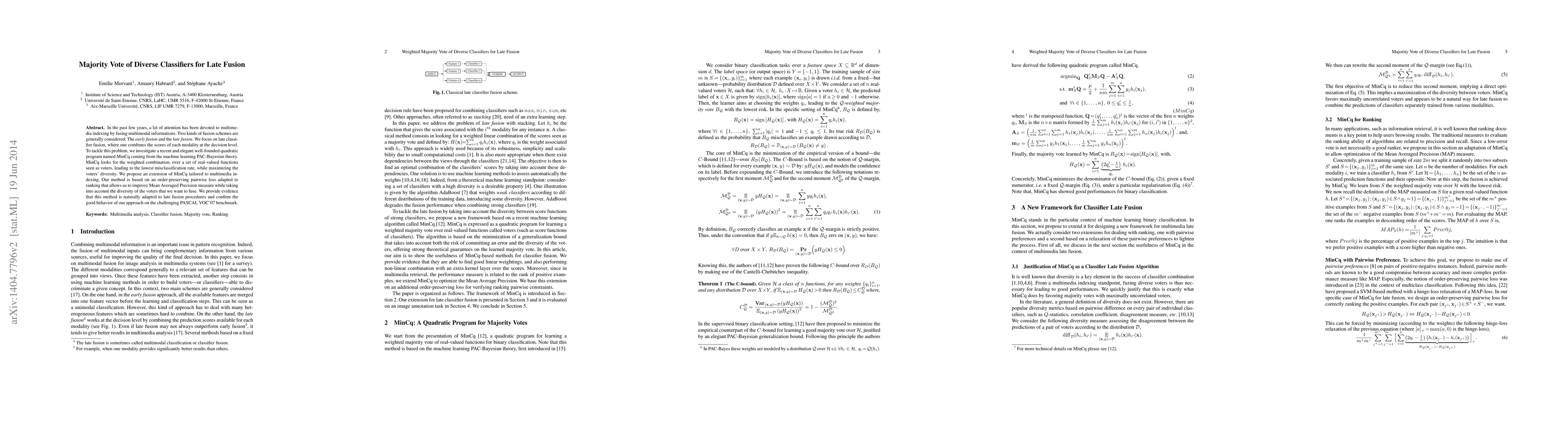 In the past few years, a lot of attention has been devoted to multimedia indexing by fusing multimodal informations. Two kinds of fusion schemes are generally considered: The early fusion and the late fusion. We focus on late classifier fusion, where one combines the scores of each modality at the decision level. To tackle this problem, we investigate a recent and elegant well-founded quadratic program named MinCq coming from the machine learning PAC-Bayesian theory. MinCq looks for the weighted combination, over a set of real-valued functions seen as voters, leading to the lowest misclassification rate, while maximizing the voters' diversity. We propose an extension of MinCq tailored to multimedia indexing. Our method is based on an order-preserving pairwise loss adapted to ranking that allows us to improve Mean Averaged Precision measure while taking into account the diversity of the voters that we want to fuse. We provide evidence that this method is naturally adapted to late fusion procedures and confirm the good behavior of our approach on the challenging PASCAL VOC'07 benchmark.
